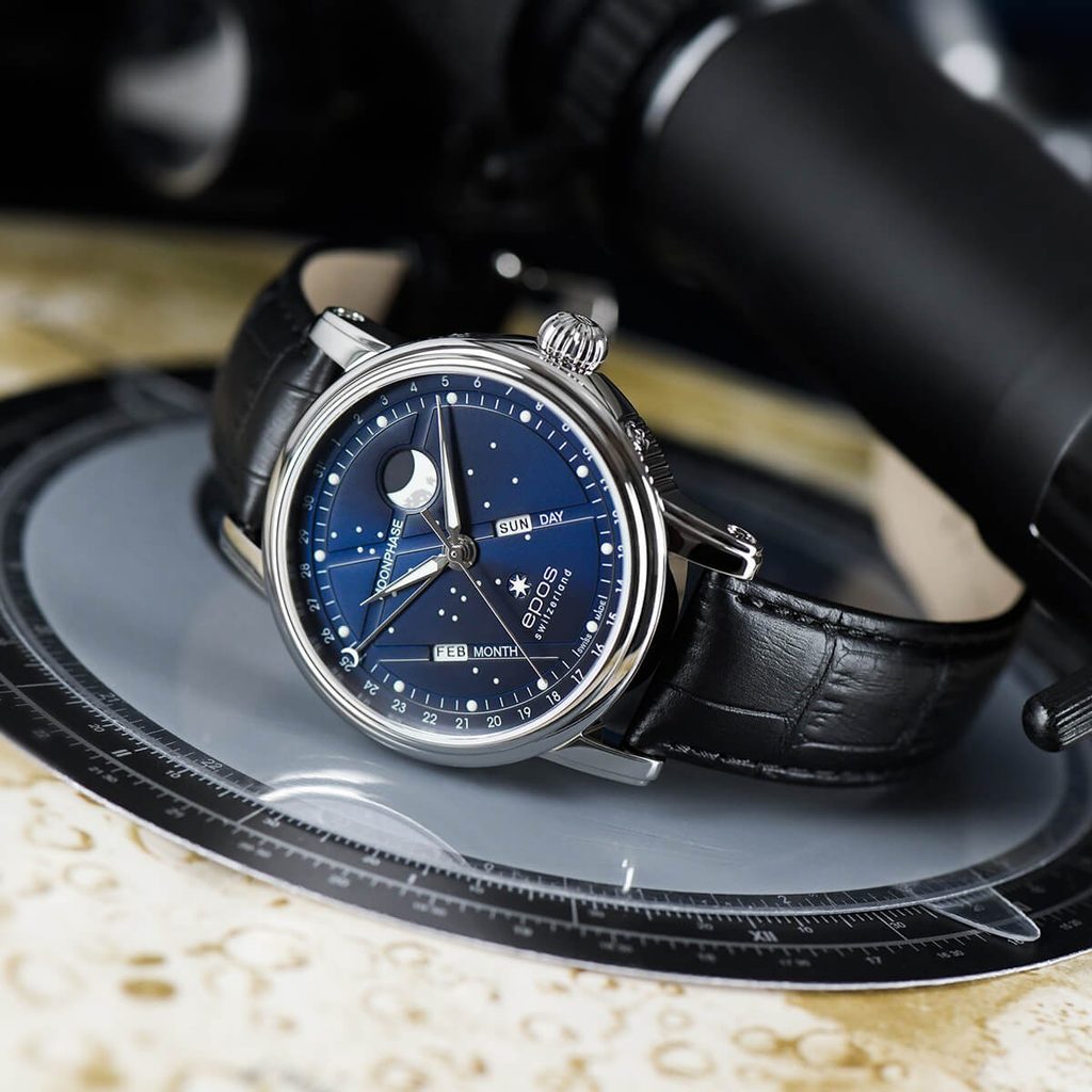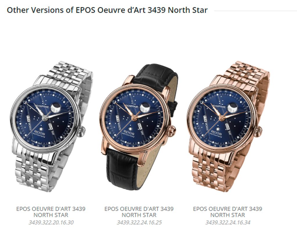 Model Epos Oeuvre D’Art North Star 3439.322.20.16.25 disponuje ukazovateľom mesačnej fázy, či ukazovateľom dňa v týždni a dokonca aj ukazovateľom aktuálneho kalendárneho mesiaca. Veľká ručička zakončená pol mesiacom ukazuje na aktuálny kalendárny deň po vnútornej lunete hodiniek. Samozrejmosťou je čisto zafírové sklo s antireflexnou vrstvou. Názov North Star potom odkazuje na hviezdu Severku (Polárku), vyobrazenú na pozícii šiestej hodiny.