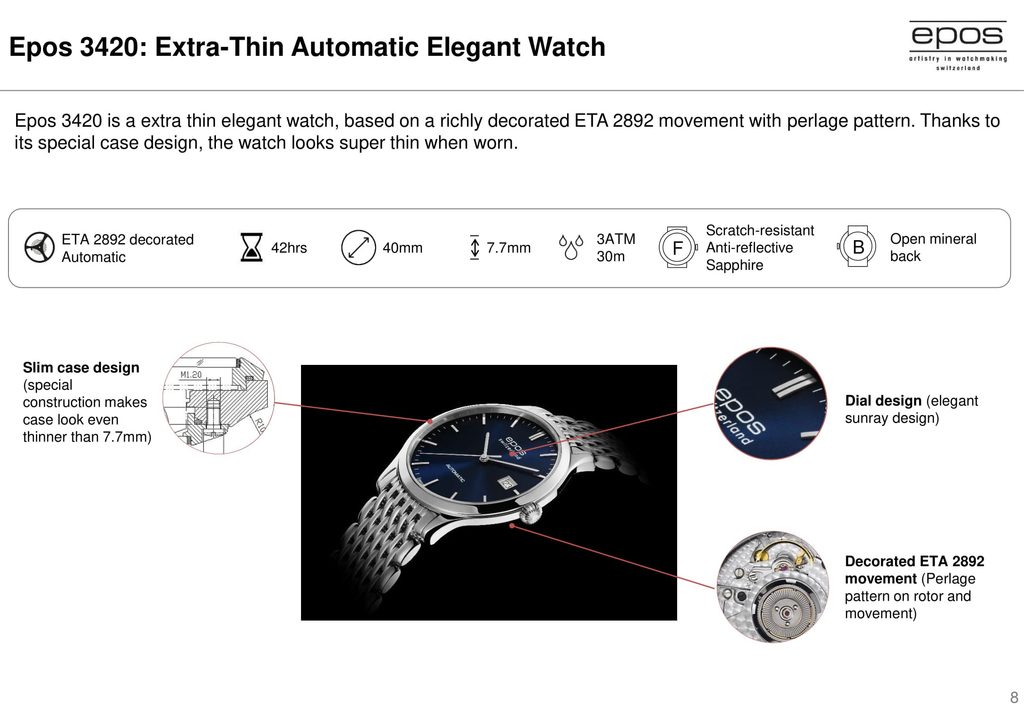 Pokiaľ vás zaujíma vyššia hodinárčina, ale nechcete platiť vyššie sumy za známejšie značky, tak by Epos mohol byť tou pravou voľbou. Užijete si tak hodinárskych komplikácií, za ktoré by ste pri iných švajčiarskych značkách museli siahnuť oveľa hlbšie do rodinného rozpočtu.