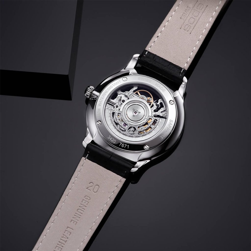 Elegantné pánske hodinky Epos Originale 3420.155.20.18.15 zaujmú na prvý pohľad priehľadným ciferníkom, cez ktorý je vidieť precízne spracovaný automatický strojček ETA 2892.