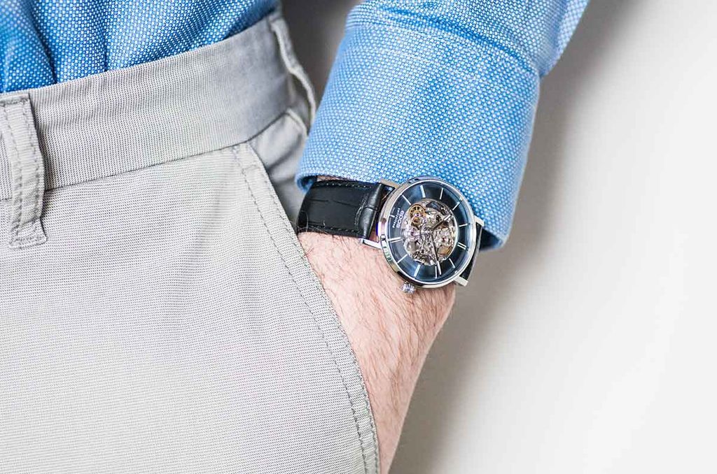 Elegantné pánske hodinky Epos Originale 3437.135.20.16.25 na prvý pohľad zaujmú priehľadným ciferníkom, cez ktorý je vidieť precízne vyrobený skeletonizovaný automatický strojček Sellita SW200.
