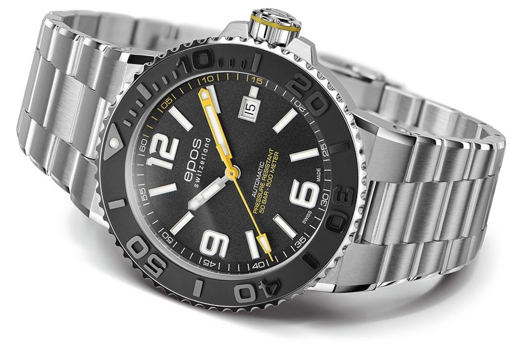 Pánske hodinky Epos Sportive 3441.131.20.55.30 sú vyrobené v obľúbenom potápačskom štýle. Čierny ciferník dopĺňajú atraktívne žlté detaily. Strojček je poháňaný automatickým strojčekom ETA 2824.