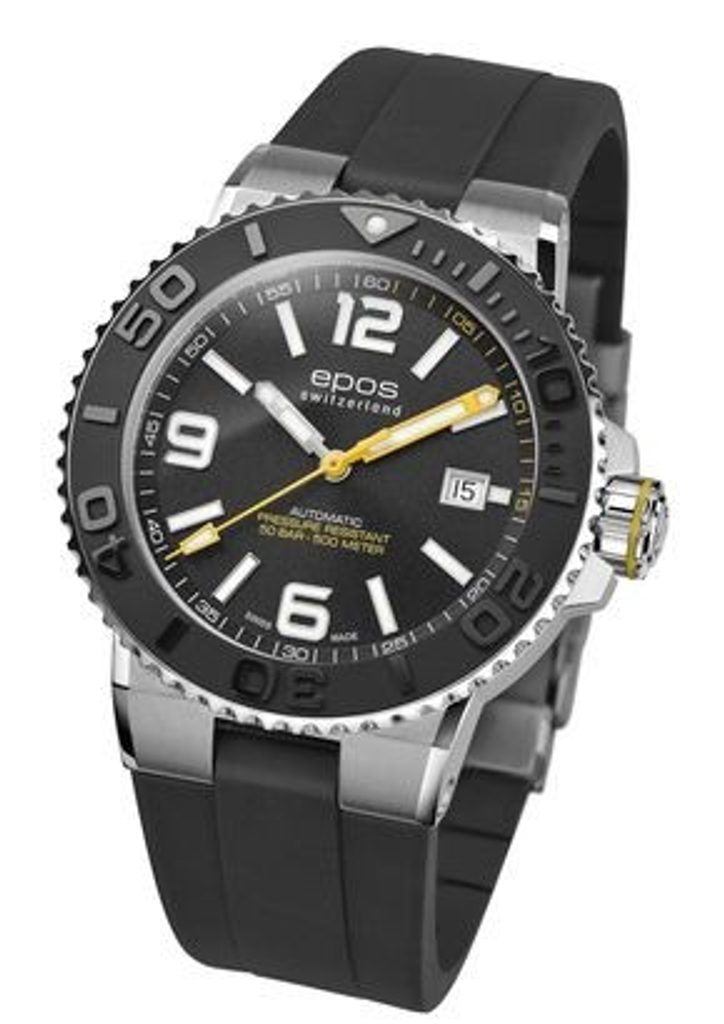 Pánske hodinky Epos Sportive 3441.131.20.55.55 sú vyrobené v obľúbenom potápačskom štýle. Celočierny dizajn je doplnený atraktívnymi žltými detailmi. Hodinky poháňa automatický strojček ETA 2824.