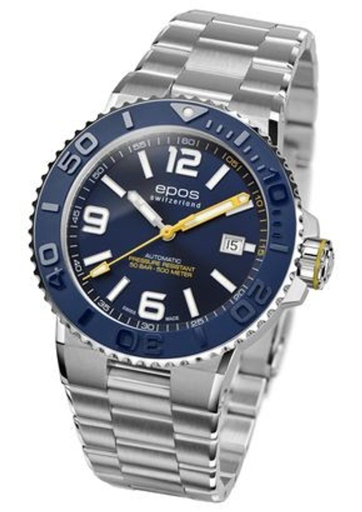 Pánske hodinky Epos Sportive 3441.131.96.56.30 sú vyrobené v obľúbenom potápačskom štýle. Modrý ciferník dopĺňajú atraktívne žlté detaily. Strojček je poháňaný automatickým strojčekom ETA 2824.