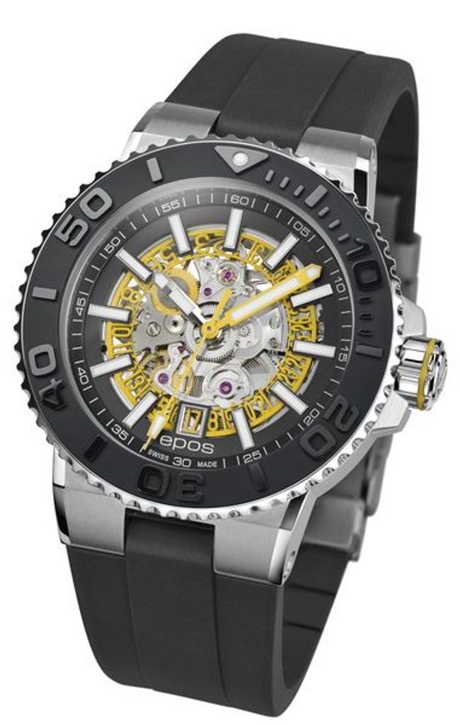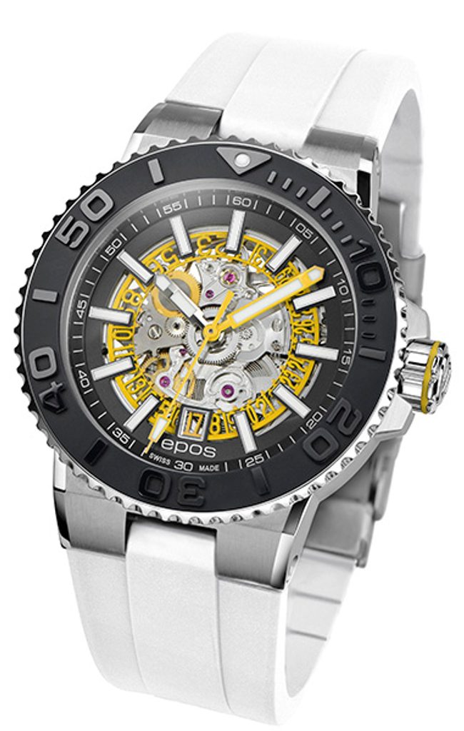 Pánske hodinky Epos Sportive 3441.135.20.15.30 sú vyrobené v obľúbenom potápačskom štýle. Tento model na prvý pohľad zaujme priehľadným ciferníkom, cez ktorý je vidieť precízne vyrobený skeletovaný automatický strojček Sellita SW200.