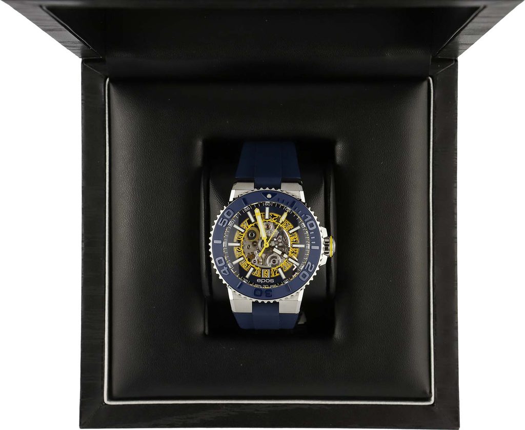 Pánske hodinky Epos Sportive 3441.135.96.16.30 sú vyrobené v obľúbenom potápačskom štýle. Tento model na prvý pohľad zaujme priehľadným ciferníkom, cez ktorý je vidieť precízne vyrobený skeletovaný automatický strojček Sellita SW200.