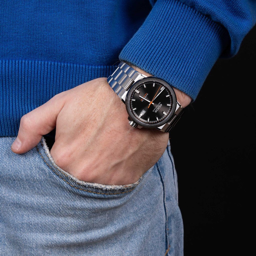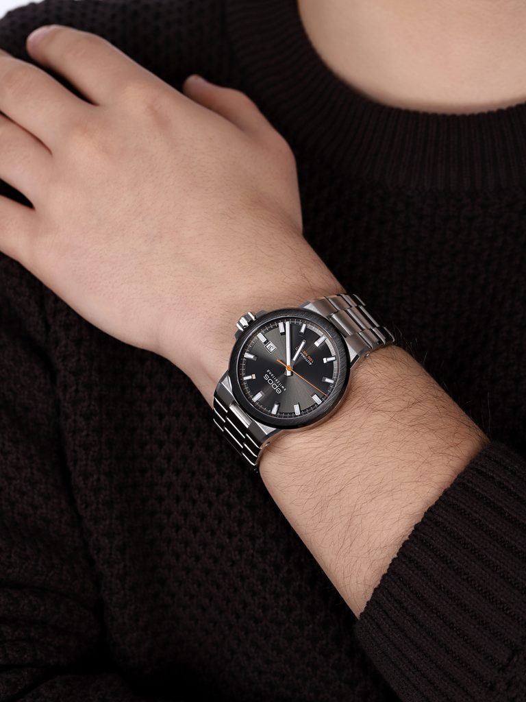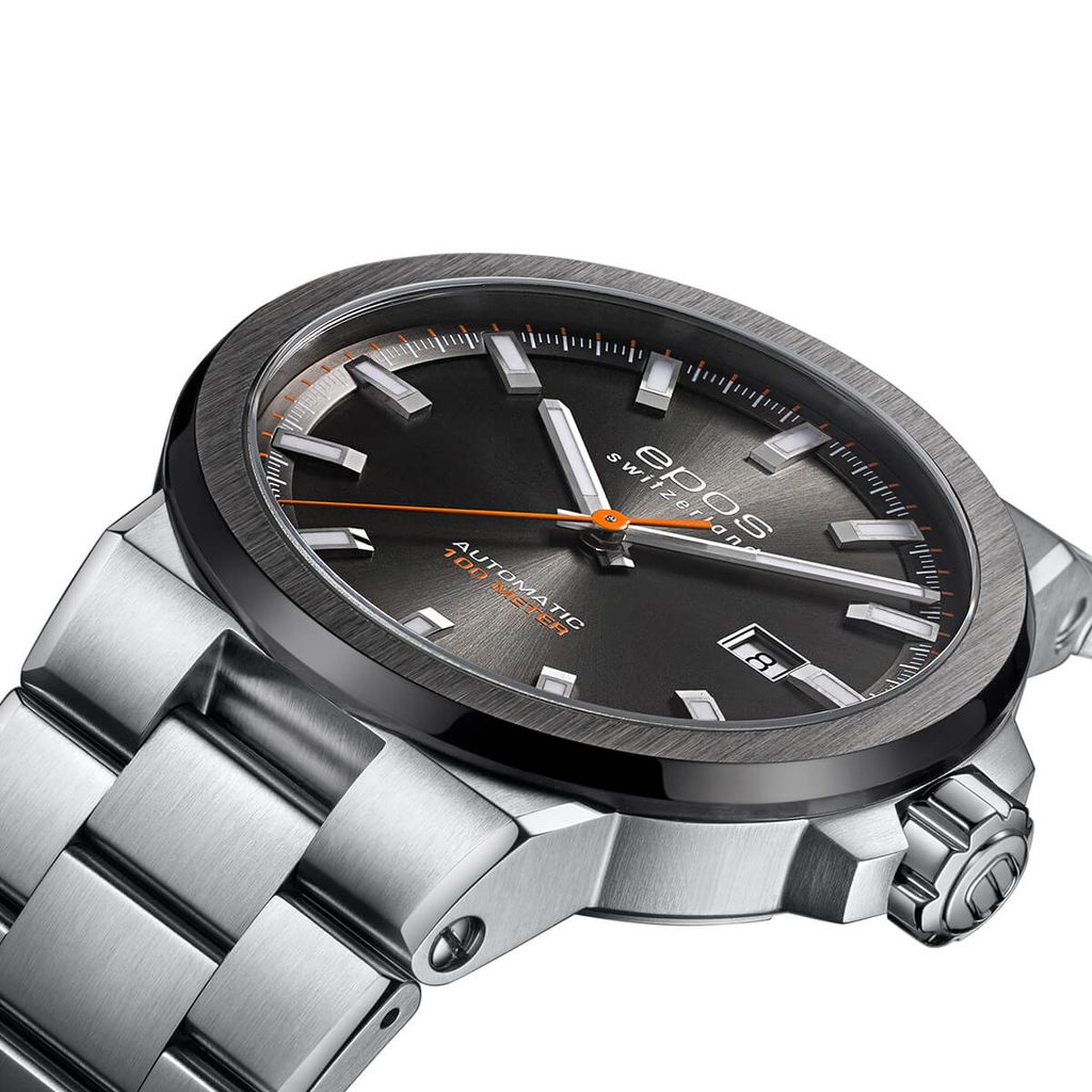 Model Epos Sportive 3442.132.35.14.30 je vybavený švajčiarskym automatickým strojčekom Sellita SW200, ktorý má tzv. funkciu hacking, pri ktorej sa sekundová ručička zastaví pri nastavovaní času. Na tradičnej pozícii 3 nájdeme ukazovateľ dátumu. Hodinky sú vyrobené v kombinácii oceľového puzdra s čiastočnou PVD čiernou povrchovou úpravou na lunete a oceľového náramku.