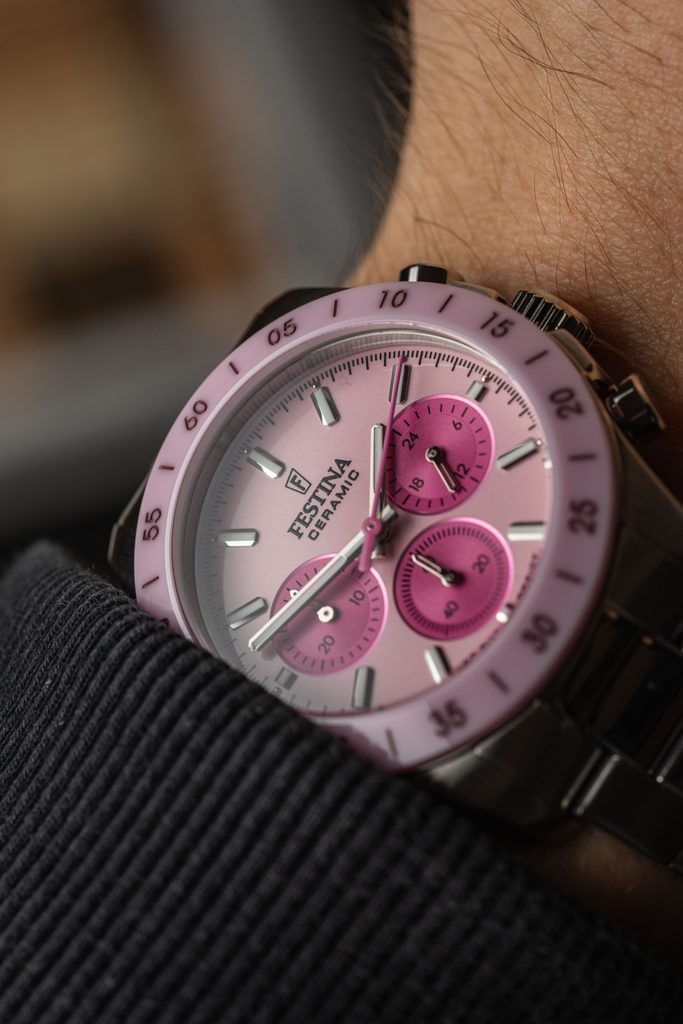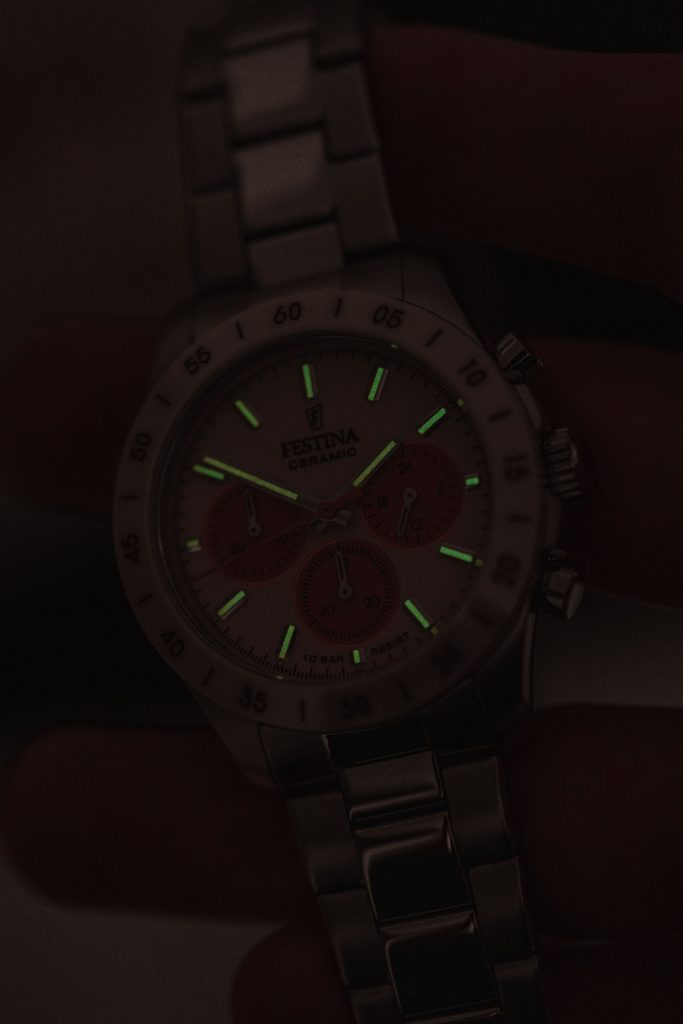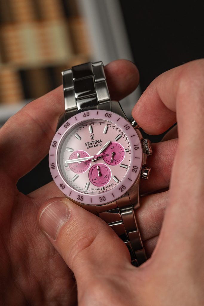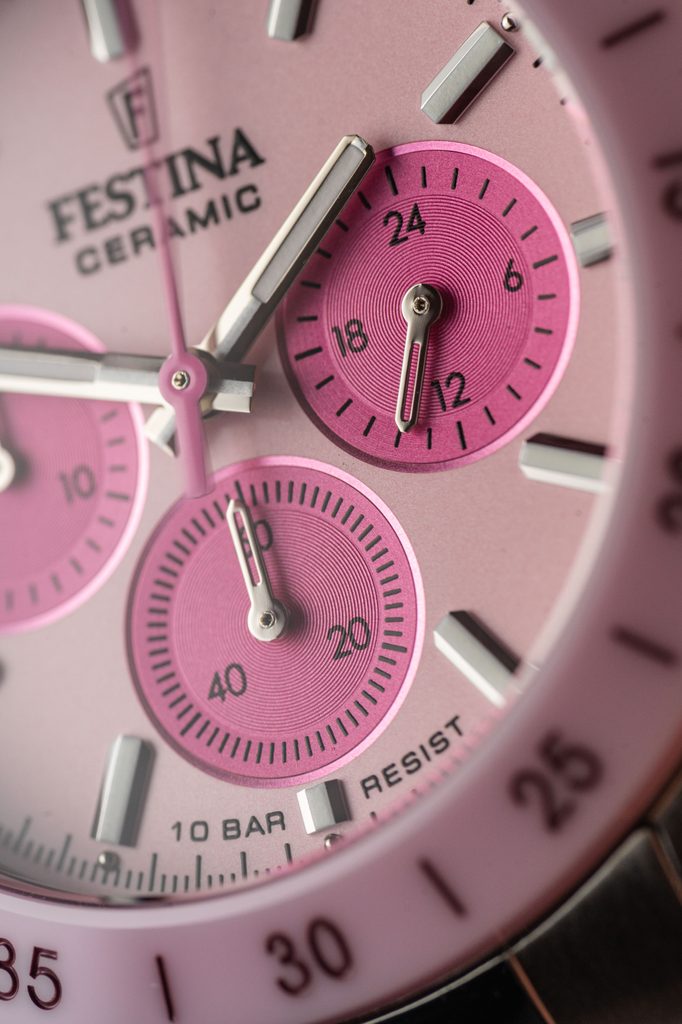 V recenziách sa často diskutuje o tom, či je luneta, t. j. obvodový prstenec okolo sklíčka, hliníková alebo oceľová. Obzvlášť cenená je keramika, ktorá má množstvo výhod - ako materiál nestarne, stále vyzerá krásne, dobre odoláva poškriabaniu a umožňuje kvalitné farebné vyhotovenie. A práve keramickú lunetu si Festina vybrala pre svoju kolekciu Ceramic. Poznáte to na prvý pohľad - luneta je krásne hladká a lesklá.