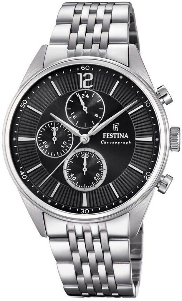 Hodinky Festina Chronograph 20285/4 sú vybavené minerálnym sklíčkom a sú vyrobené v celooceľovej konštrukcii. Z funkcií hodinky ponúkajú stopky (chronograf) a 24-hodinový ciferník. Vodotesnosť je 50 metrov (5ATM) - vhodné na umývanie rúk, sprchovanie.