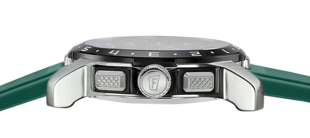 Okrúhle titánové puzdro s priemerom 44 mm zaraďuje model do kategórie väčších hodiniek. Hoci na ciferníku nájdete len málo údajov, v žiadnom prípade mu nechýba prehľadnosť a čitateľnosť. Tú okrem iného zabezpečuje výrazná farba minútovej ručičky aj hodinových indexov.
