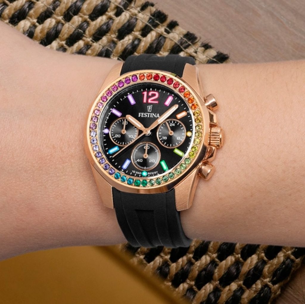 Hodinky Festina 20611/3 z novej kolekcie Festina Rainbow inšpirovanej farbami dúhy. Celá kolekcia je určená pre všetky moderné ženy, ktoré hľadajú hodinky, ktoré budú zdobiť ich zápästie v každej situácii.