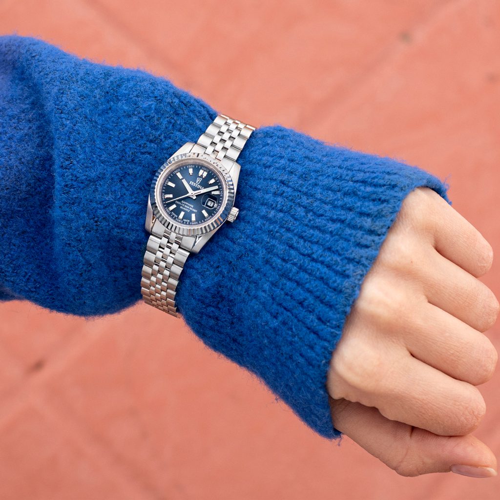 Hodinky sú vyrobené v celooceľovom dizajne. Modrý ciferník je zasadený do 29 mm oceľového puzdra. Na ciferníku, chránenom zafírovým sklíčkom, ktoré je takmer nemožné poškriabať, nájdeme decentné logo značky, okienko s dátumovkou a luminiscenčné ručičky a indexy.