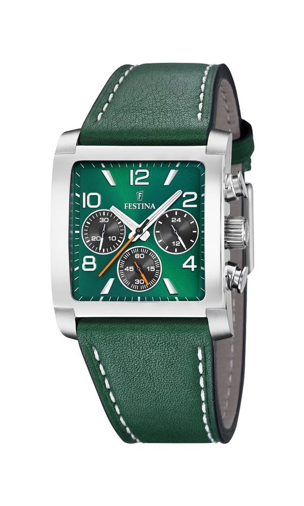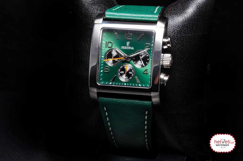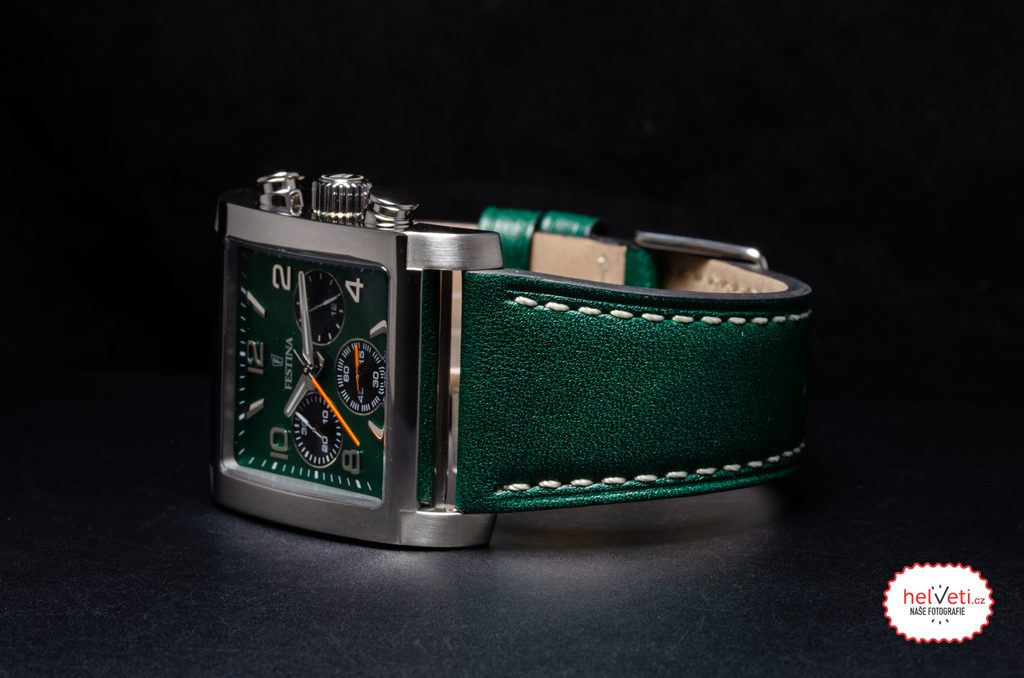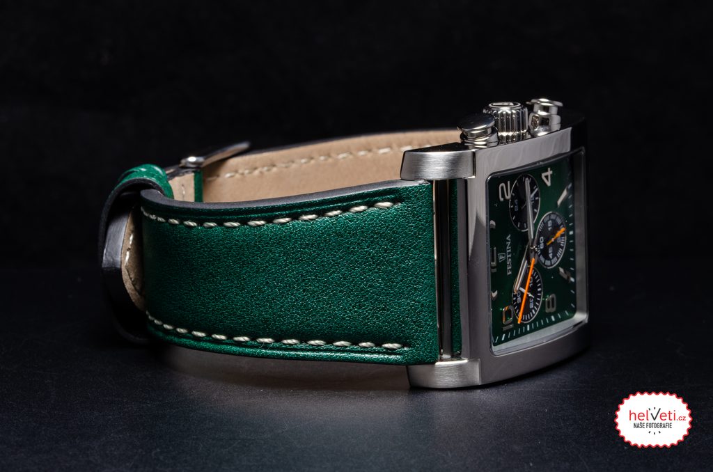 Pánske quartzové hodinky 20653/2 majú hranaté oceľové puzdro a zelený kožený remienok. Majú funkciu stopiek a vodotesnosť 50 metrov.