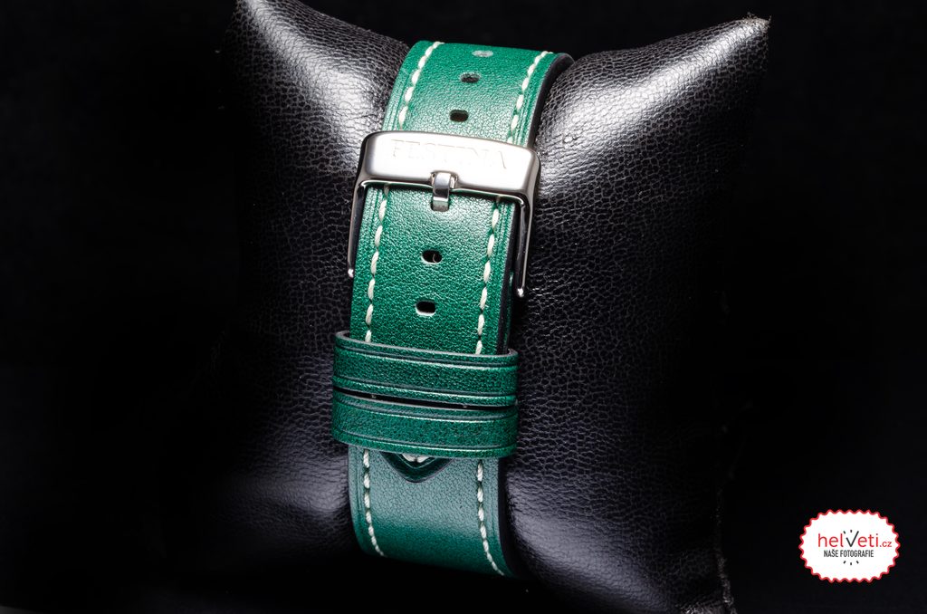 Tmavozelený ciferník je chránený minerálnym sklíčkom.