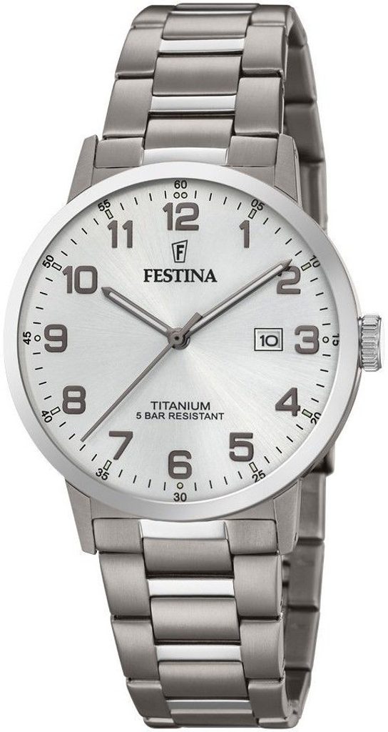 Hodinky Festina sú ideálne pre všetkých mužov, ktorí ocenia klasické doplnky vysokej kvality. Strieborný ciferník v klasickom štýle zdobia číselné indexy sluminiscenčnýmiručičkami . Na pozícii troch hodín sa nachádza aj užitočnýukazovateľ dátumu . Titánový strojček spolu s titánovýmpuzdrom tvoria dokonalý celok. Titán je veľmi ľahký, odolnejší ako oceľ a antialergický. Stavte na klasické hodinky Festina a tešte sa pozornosti širokej verejnosti.
