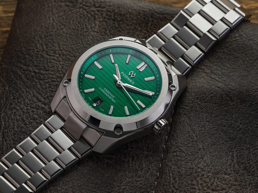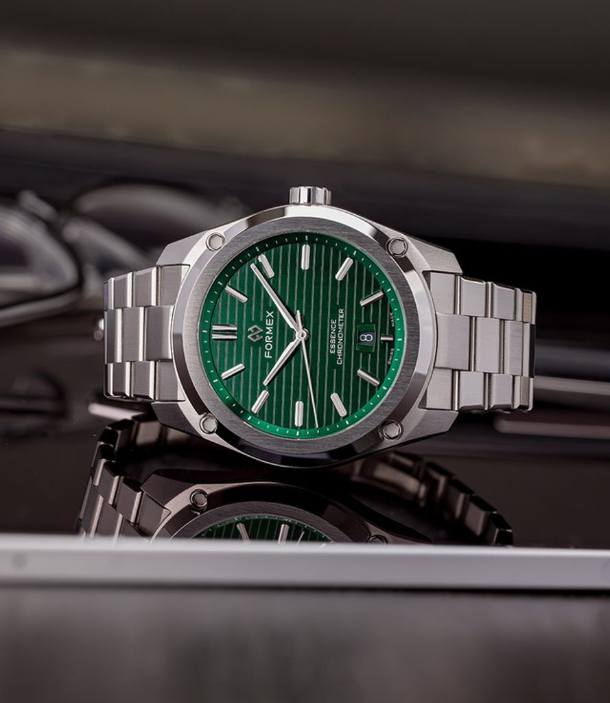 Švajčiarske hodinky Formex Essence FortyThree Automatic Chronometer Green na prvý pohľad zaujmú výrazným kartáčovaným puzdrom s efektnými leštenými plochami a výrazne štruktúrovaným ciferníkom. Ide o moderný pohľad na univerzálne hodinky vhodné na každú príležitosť, ktoré sa vyznačujú jednoduchými líniami a skvelou prehľadnosťou. Vďaka celkovému súboru funkcií sú modely Formex Essence veľmi obľúbené u priaznivcov hodiniek.