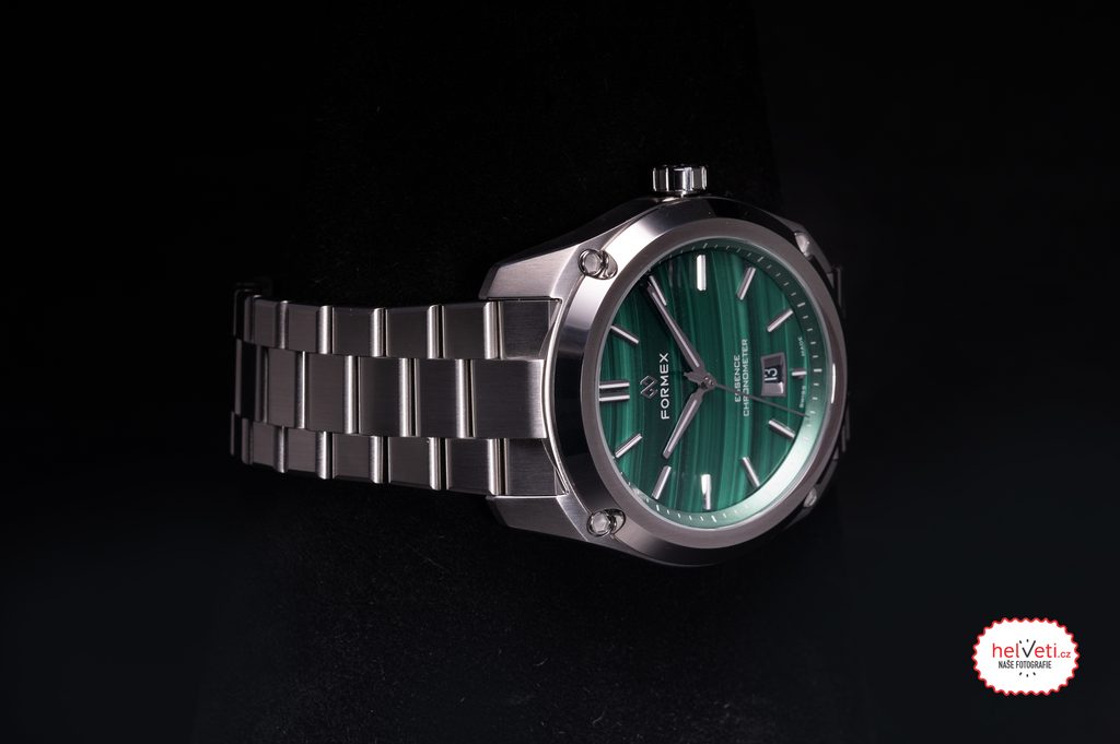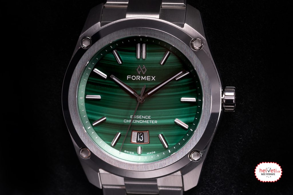 Medzi klasické charakteristické znaky hodiniek Formex Essence FortyThree Automatic Chronometer Malachite patrí výrazný ryhovaný ciferník, systém zavesenia puzdra, vyššia vodotesnosť a jemná mikroregulovateľná spona. Priehľadný ciferník chráni zafírové sklíčko s vnútornou antireflexnou vrstvou a vysokou odolnosťou proti poškriabaniu. Zafír bol použitý aj na vieko, cez ktorý možno pozorovať činnosť zdobeného strojčeka s modrými skrutkami. Lepšiu čitateľnosť za zhoršených svetelných podmienok zabezpečuje luminiscencia (BGW9 Super-LumiNova) umiestnená na ručičkách a ručne nanesených indexoch. Celkový dojem umocňuje citlivo navrhnutý ukazovateľ dátumu na pozícii 6 hodín. Na hodinkách najviac oceníte ich všestrannosť; vďaka súboru funkcií sú ideálne na použitie pri športe, vo vode, ale aj na každodenné používanie.