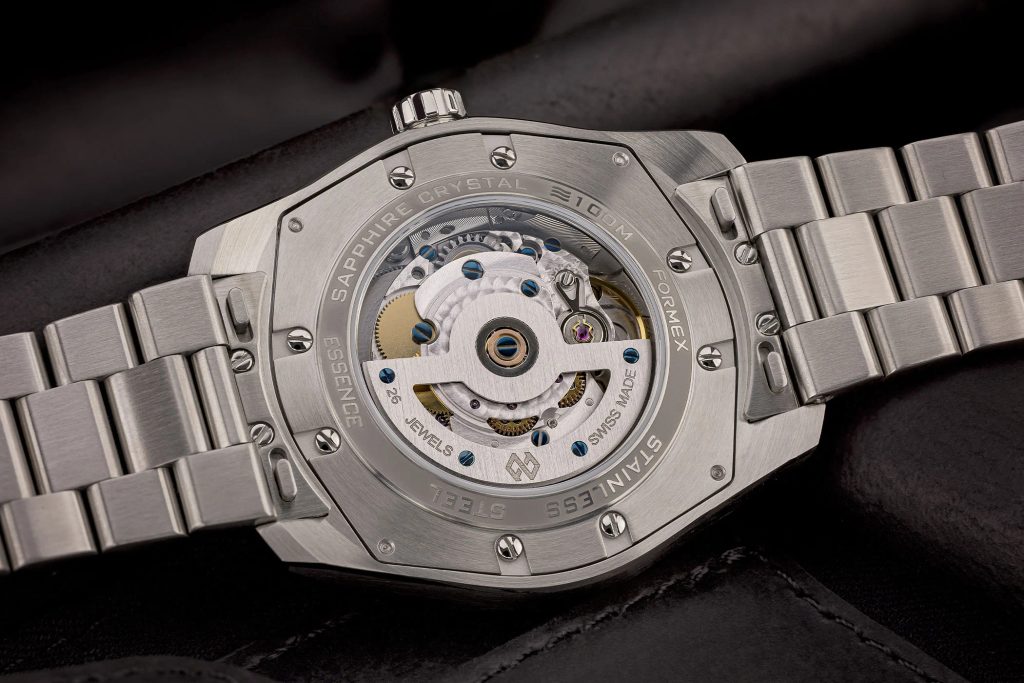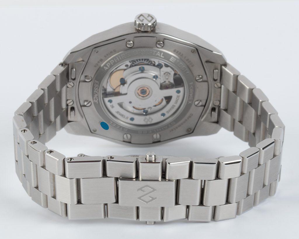Medzi klasické charakteristické znaky hodiniek Formex Essence FortyThree Automatic Chronometer White patrí výrazný ryhovaný ciferník, systém zavesenia puzdra, vyššia vodotesnosť a jemná mikroregulovateľná spona. Priehľadný ciferník chráni zafírové sklíčko s vnútornou antireflexnou vrstvou a vysokou odolnosťou proti poškriabaniu. Zafír bol použitý aj na ciferník, cez ktorý možno pozorovať činnosť zdobeného strojčeka s modrými skrutkami. Lepšiu čitateľnosť za zhoršených svetelných podmienok zabezpečuje luminiscencia (BGW9 Super-LumiNova) umiestnená na ručičkách a indexoch. Práve ryhovaný ciferník a indexy vo vysokom lesku pôsobia veľmi zaujímavo. Celkový dojem podčiarkuje citlivo navrhnutý ukazovateľ dátumu na pozícii 6 hodín. Na hodinkách najviac oceníte ich všestrannosť; súbor funkcií ich predurčuje na použitie pri športe, vo vode, ale aj na každodenné používanie.