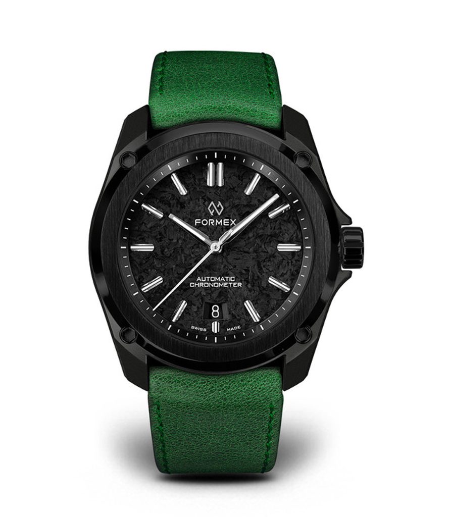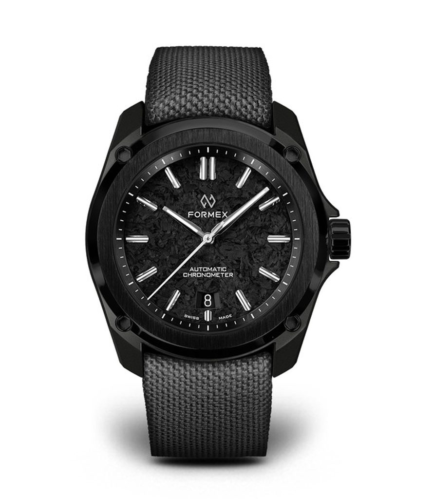 Švajčiarske hodinky Formex Essence Leggera FortyOne Automatic Chronometer Forged Carbon na prvý pohľad zaujmú čiernym puzdrom s keramickou lunetou s efektným brúseným povrchom a nezvyčajným ciferníkom z uhlíkových vlákien s originálnym vzorom na každom jednotlivom kuse. Sú ideálnou voľbou pre všetkých priaznivcov hodiniek, ktorí sú fanúšikmi aktívneho životného štýlu aj modernej formy všestranných hodiniek vhodných na každú príležitosť, vyznačujúcich sa jednoduchými líniami a skvelou prehľadnosťou.