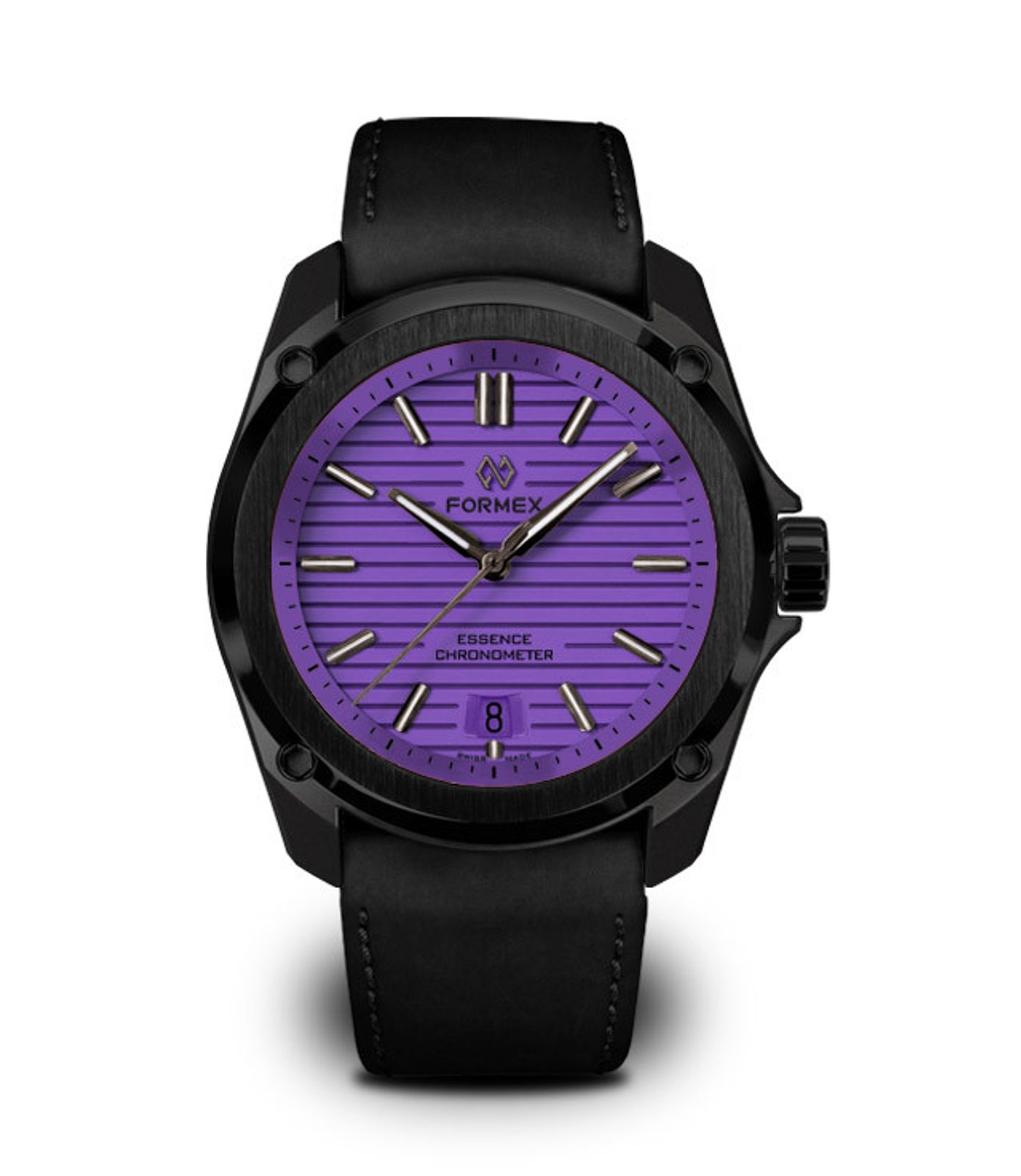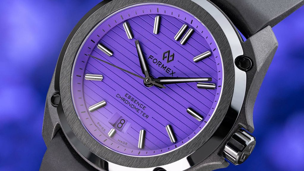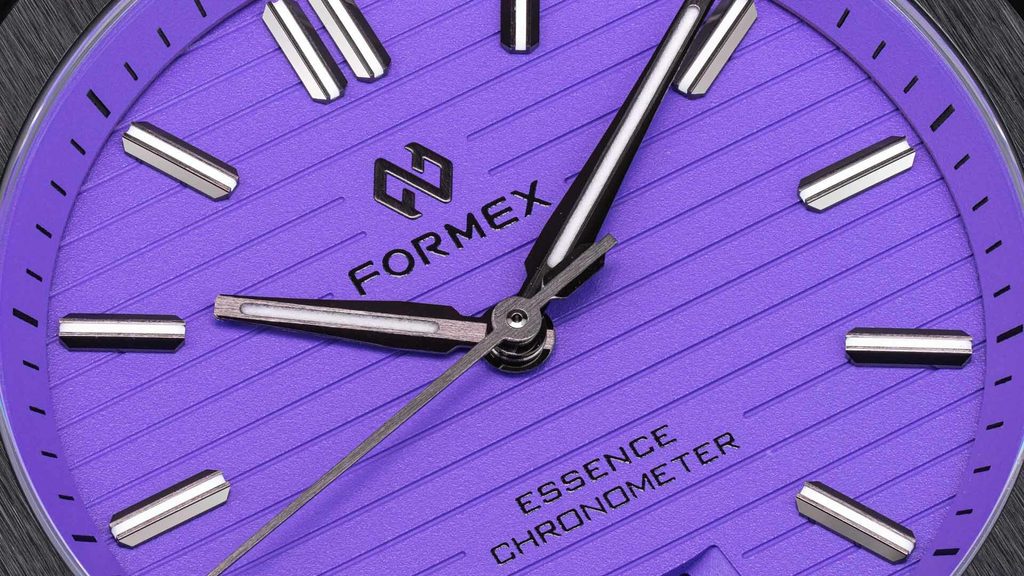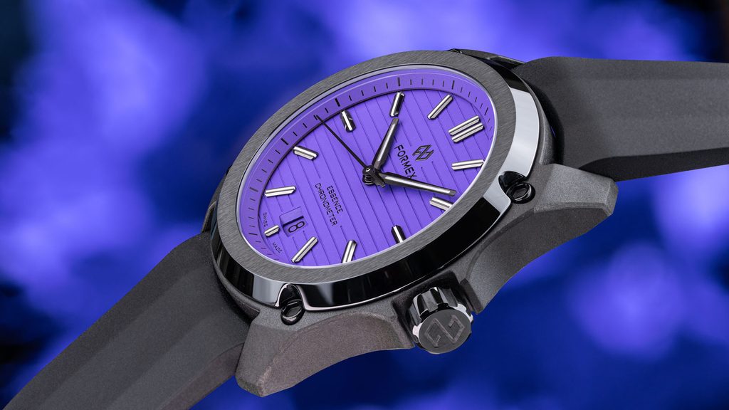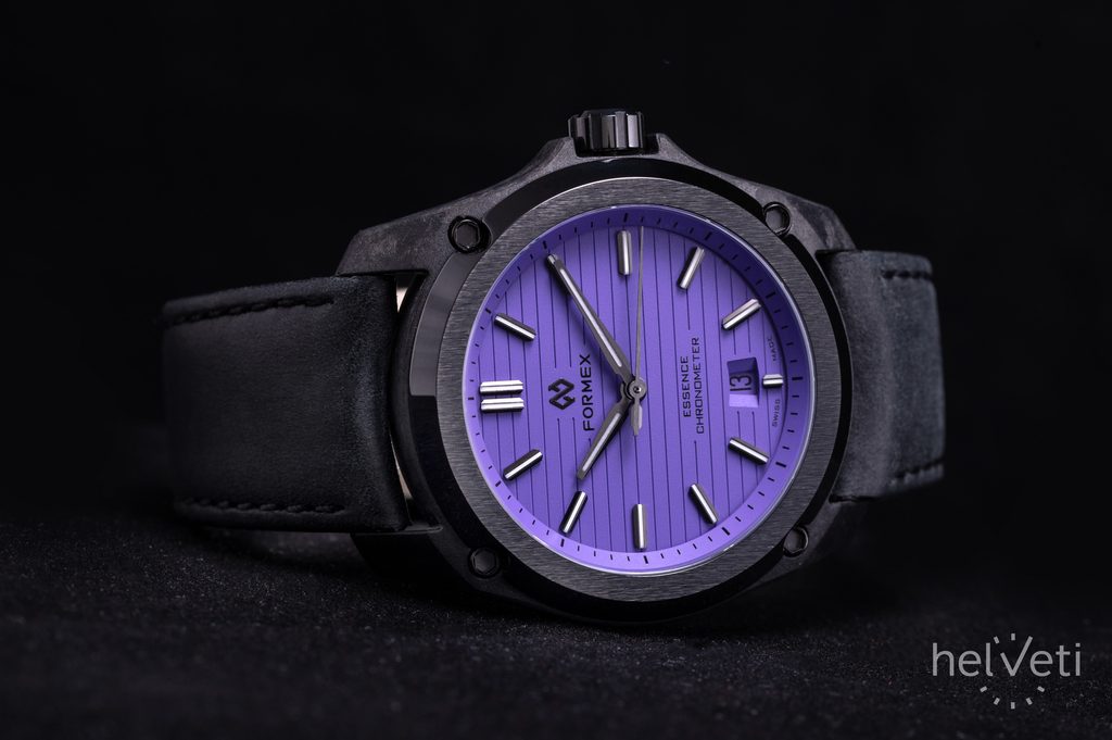 Švajčiarske hodinky Formex Essence Leggera FortyOne Automatic Chronometer "Splash" Lavender Purple 0331.4.6397.711 na prvý pohľad zaujmú čiernym puzdrom s keramickou lunetou s efektným brúseným povrchom a výrazným fialovým frézovaným ciferníkom. Je ideálnou voľbou pre všetkých priaznivcov hodiniek, ktorí sú fanúšikmi aktívneho životného štýlu aj modernej podoby univerzálnych hodiniek vhodných na každú príležitosť, vyznačujúcich sa jednoduchými líniami a skvelou prehľadnosťou.