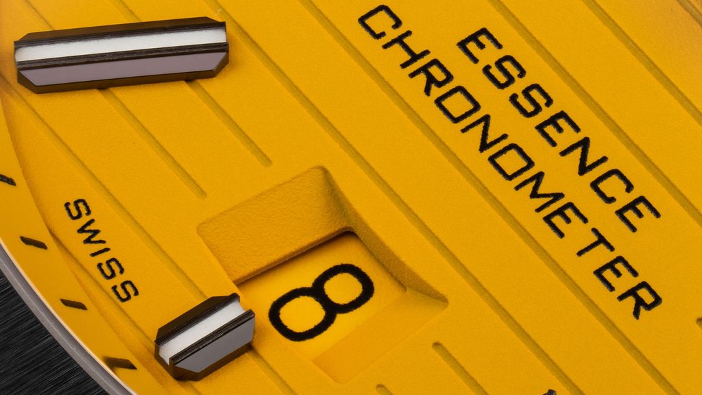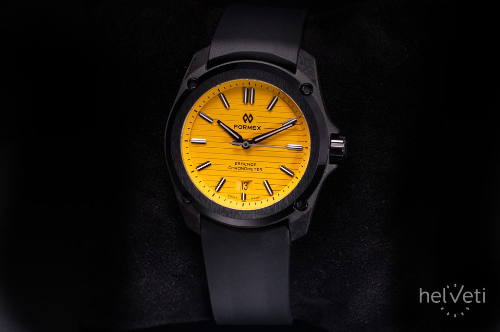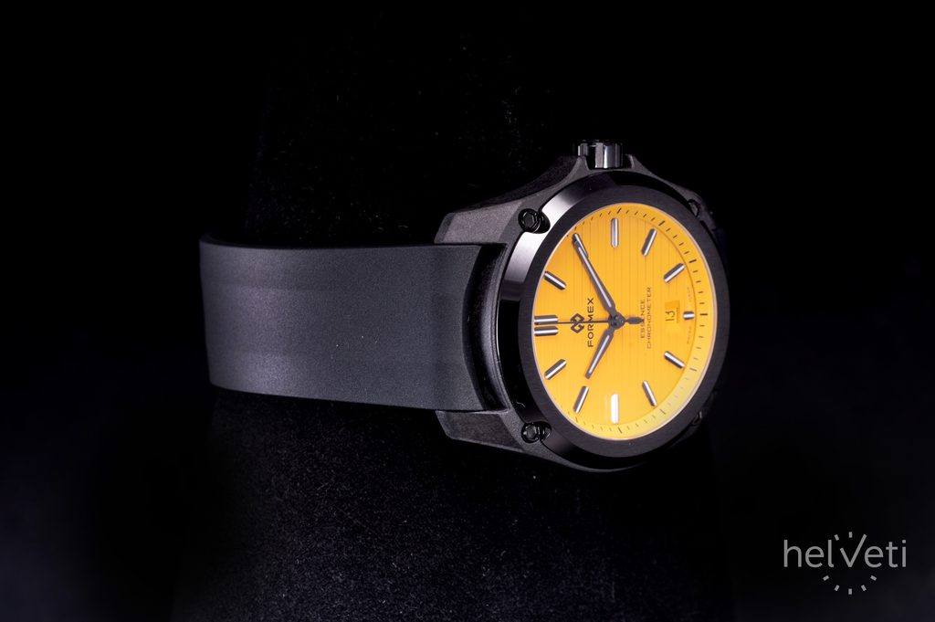 Švajčiarske hodinky Formex Essence Leggera FortyOne Automatic Chronometer "Splash" Sunflower Yellow 0331.4.6387.910 zaujmú na prvý pohľad čiernym puzdrom s keramickou lunetou s efektným brúseným povrchom a výrazným žltým frézovaným ciferníkom. Je ideálnou voľbou pre všetkých priaznivcov hodiniek, ktorí sú fanúšikmi aktívneho životného štýlu aj modernej podoby univerzálnych hodiniek vhodných na každú príležitosť, vyznačujúcich sa jednoduchými líniami a skvelou prehľadnosťou.