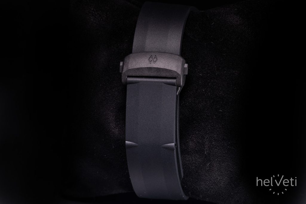 Puzdro dopĺňa čierny gumený remienok zakončený skladacou sponou s inovatívnym systémom jemného mikroregulovania do 7 mm.