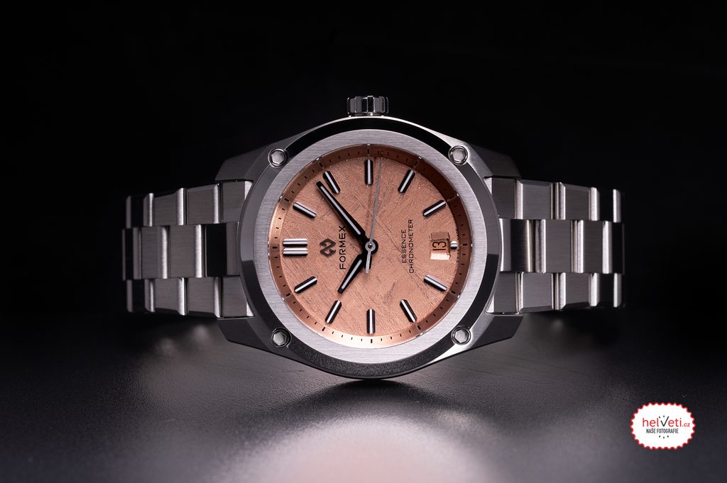 Medzi klasické charakteristické znaky hodiniek Formex Essence ThirtyNine Automatic Chronometer Space Gold patrí výrazný pozlátený meteoritový ciferník, systém zavesenia puzdra, vyššia vodotesnosť a jemná mikroregulovateľná spona. Prehľadný ciferník chráni zafírové sklíčko s vnútornou antireflexnou vrstvou a vysokou odolnosťou proti poškriabaniu. Zafír bol použitý aj na vieko, cez ktoré možno pozorovať činnosť zdobeného strojčeka s modrými skrutkami. Lepšiu čitateľnosť za zhoršených svetelných podmienok zabezpečuje luminiscencia (BGW9 Super-LumiNova) umiestnená na ručičkách a indexoch. Práve ružovozlatý meteoritový ciferník a indexy vo vysokom lesku dodávajú hodinkám veľmi zaujímavý efekt. Celkový dojem podčiarkuje citlivo navrhnutý ukazovateľ dátumu na pozícii 6 hodín. Na hodinkách najviac oceníte ich všestrannosť; súbor funkcií ich predurčuje na použitie pri športe, vo vode, ale aj na každodenné používanie.