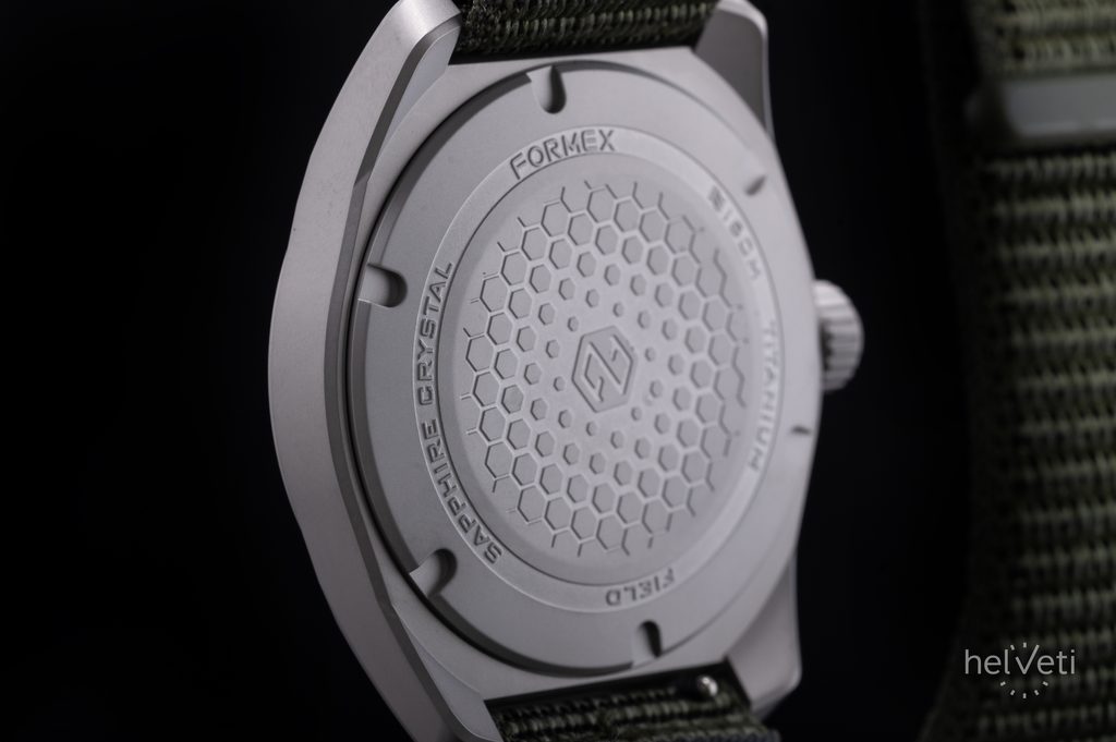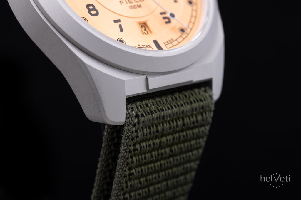 Puzdro hodiniek Formex Field Automatic Gen 2 Coho Salmon je vyrobené z titánu 2. triedy a pre zvýšenie odolnosti je vybavené špeciálnym kalením, ktoré zvyšuje povrchovú tvrdosť zo 145 Vickersov na približne 900 Vickersov. To všetko pri zachovaní nízkej hmotnosti, vysokého komfortu a hypoalergénnych vlastností titánu. Puzdro dopĺňa veľmi pohodlný zelený nylonový remienok na suchý zips, zakončený uzáverom na suchý zips.