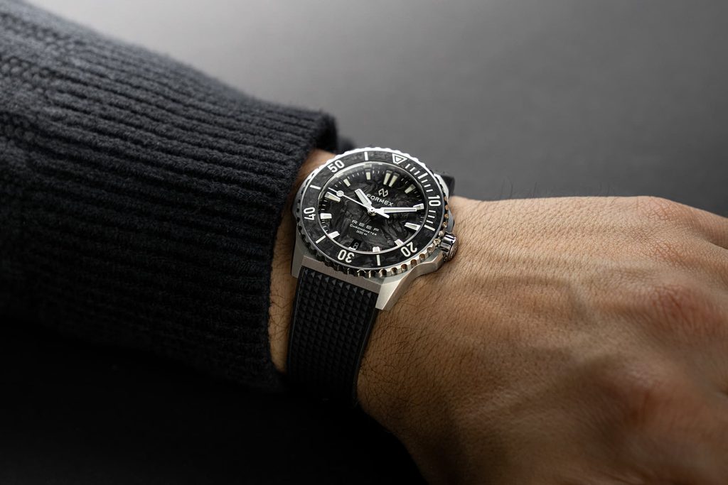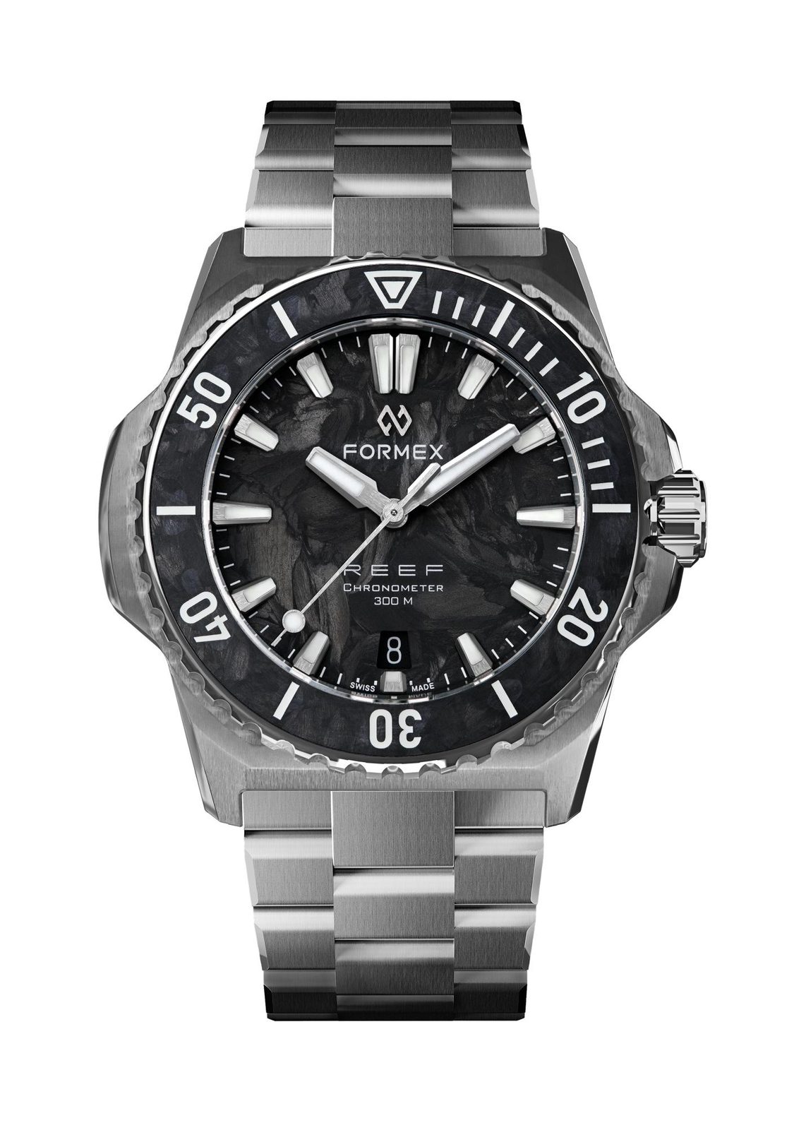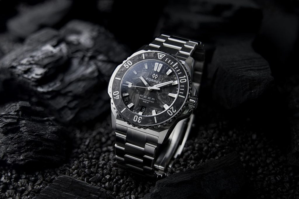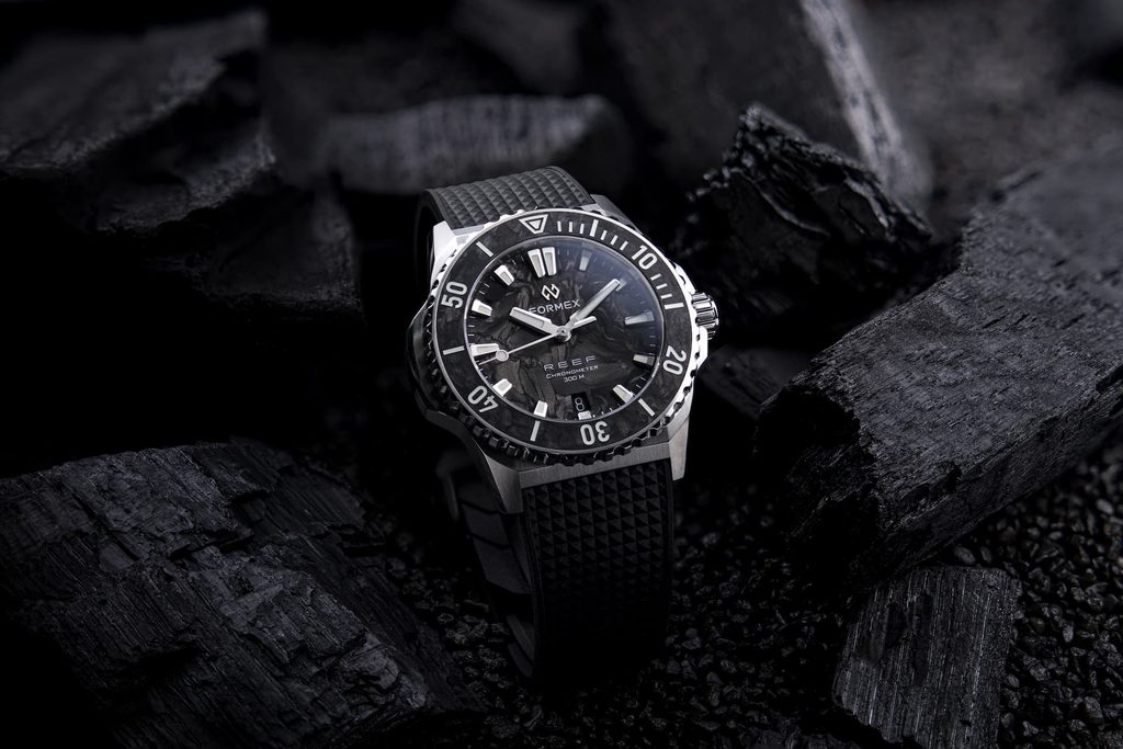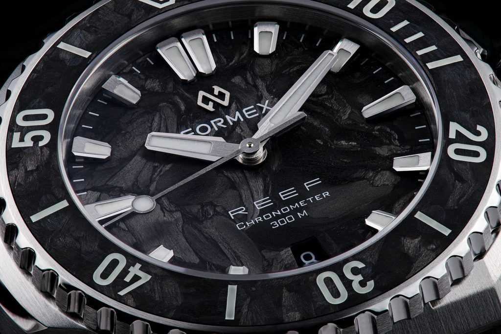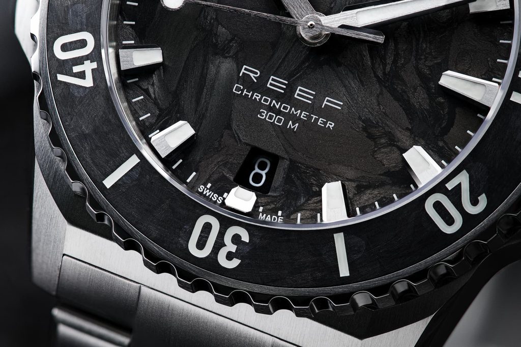 Karbon prináša do kolekcie Reef nový vizuálny zážitok. Každý ciferník a lunetová vložka majú vďaka výrobnému procesu jedinečnú štruktúru a vzor. Krátke uhlíkové vlákna sa pod tlakom a teplom vtláčajú do kompozitu, čím sa vytvára povrch s prirodzenou hĺbkou a variabilitou. Keď na ciferník dopadá svetlo, pripomína pohyb vodnej hladiny, jemný, plynulý a neustále sa meniaci.
