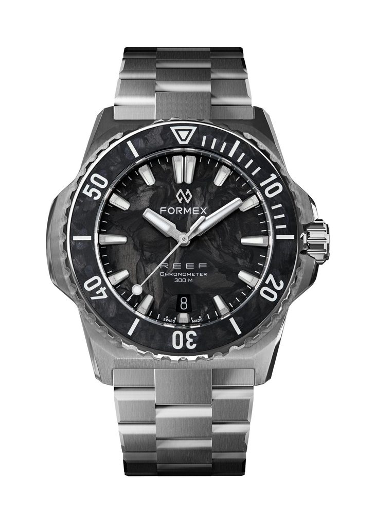 Švajčiarske potápačské hodinky Formex Reef 39.5 Automatic Chronometer Forged Carbon 2201.1.6399.100 na prvý pohľad zaujmú lunetou a jedinečným ciferníkom z kovaného karbónu, ktorý dodáva každému kusu úplne originálny vzhľad. Výrazné puzdro s čistými líniami podčiarkuje moderný, všestranný a technicky vyspelý charakter celej kolekcie Reef.