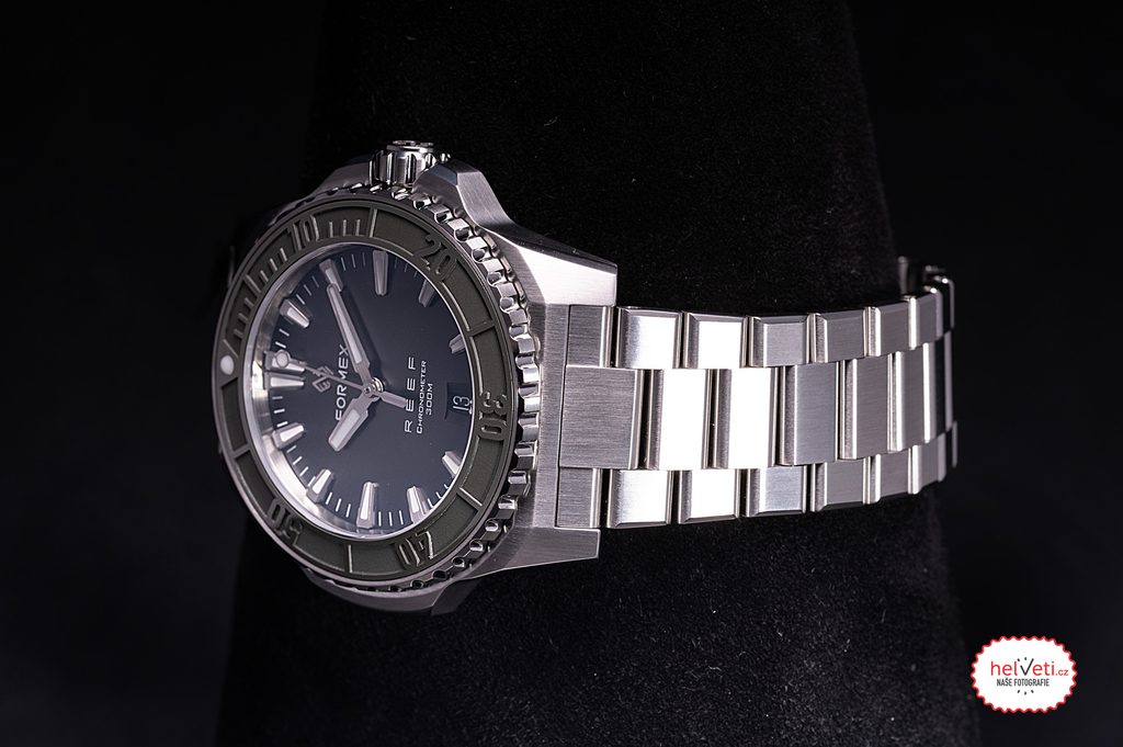 Medzi klasické charakteristické znaky hodiniek Formex Reef 42 Automatic Chronometer patrí výrazný a ľahko čitateľný ciferník, vyššia vodotesnosť a jemná mikroregulovateľná spona. Prehľadný ciferník chráni zafírové sklíčko s vnútornou antireflexnou vrstvou a vysokou odolnosťou proti poškriabaniu. Lepšiu čitateľnosť za zhoršených svetelných podmienok zabezpečuje luminiscencia (BGW9 Super-LumiNova) umiestnená na ručičkách a indexoch. Ciferník z dielne Formex poteší efektom slnečného lúča a podobou ručne aplikovaných plastových trojuholníkových indexov, ktoré sa zvažujú od okrajov smerom k stredu ciferníka. Celkový dojem umocňuje citlivo riešená dátumovka na 6. hodine. Na hodinkách najviac oceníte ich všestrannosť; vďaka súboru funkcií sú ideálne na použitie pri športe, vo vode, ale aj na každodenné používanie.