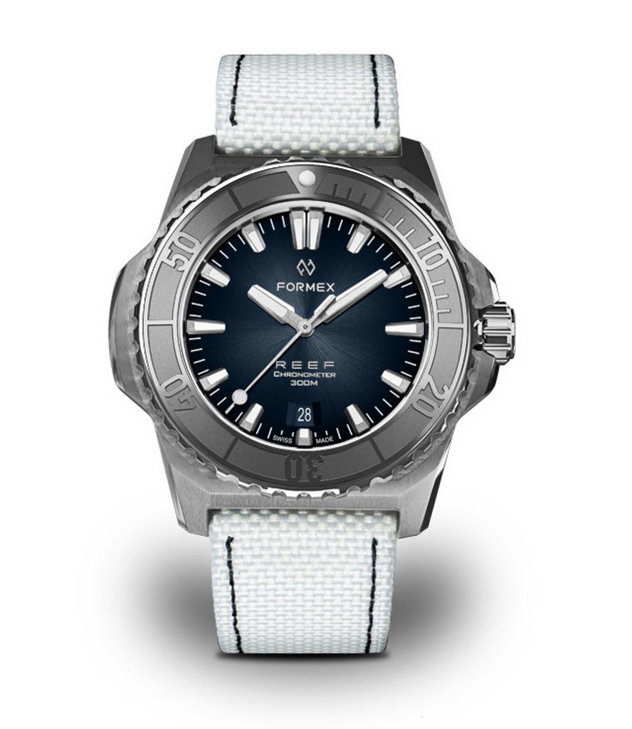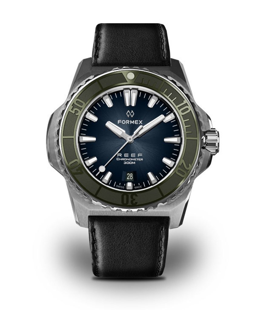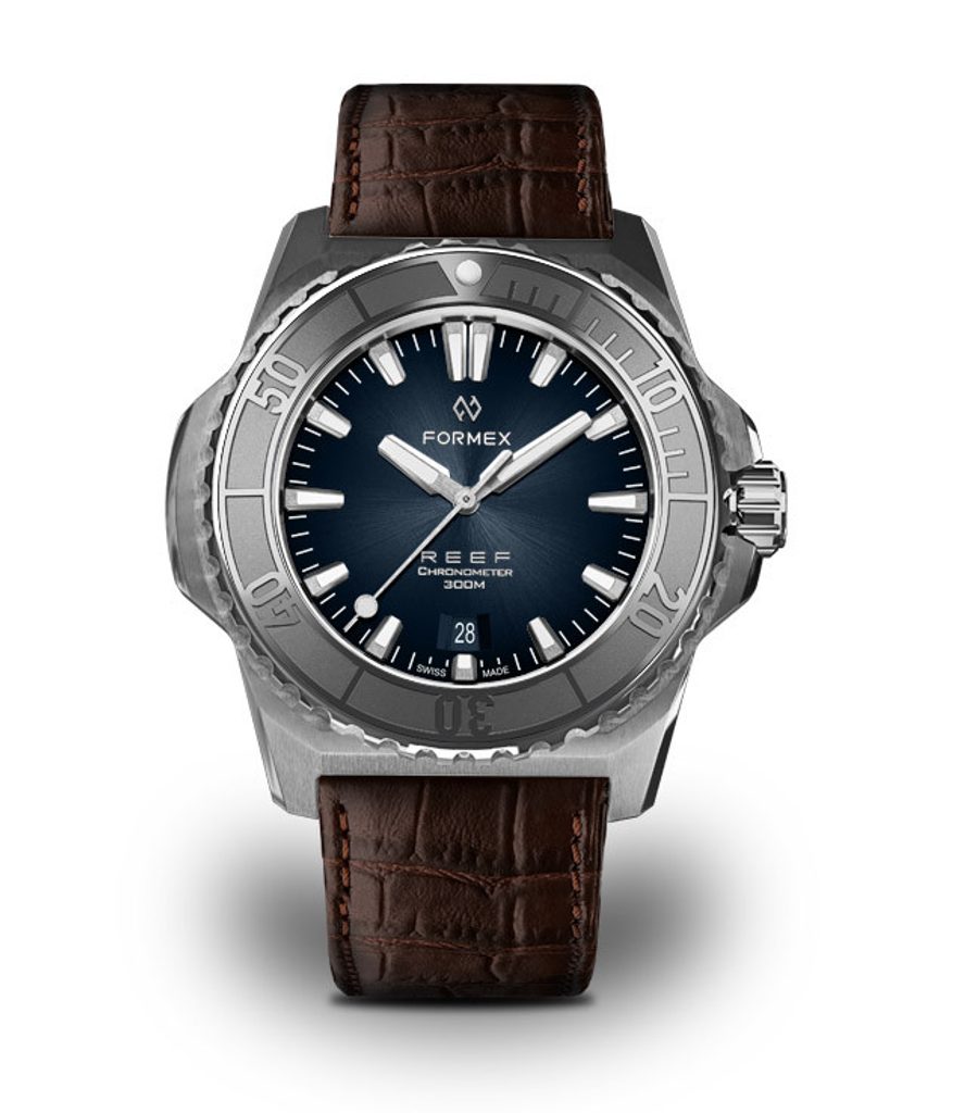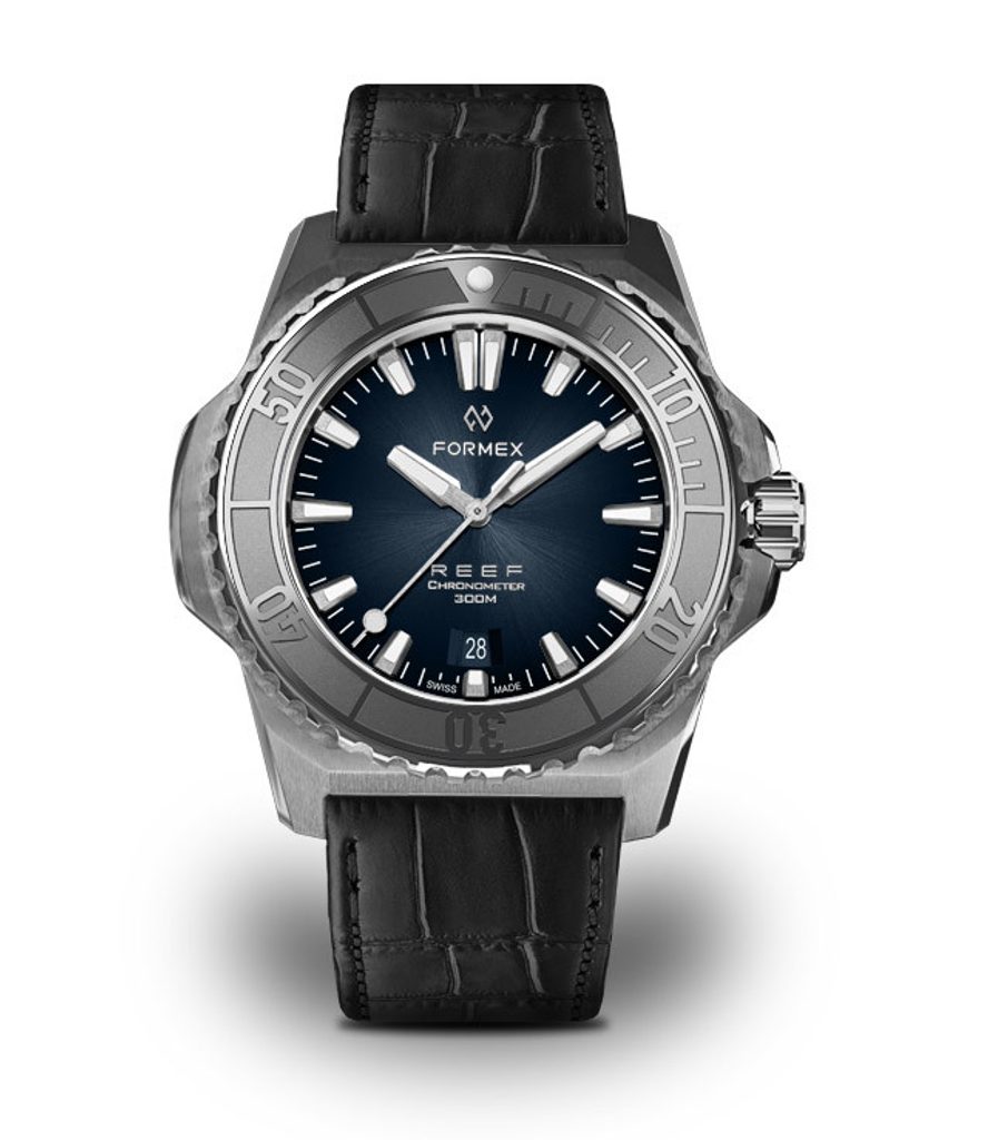 Medzi klasické charakteristické znaky hodiniek Formex Reef 42 Automatic Chronometer patrí výrazný a ľahko čitateľný ciferník, vyššia vodotesnosť a jemná mikroregulovateľná spona. Prehľadný ciferník chráni zafírové sklíčko s vnútornou antireflexnou vrstvou a vysokou odolnosťou proti poškriabaniu. Lepšiu čitateľnosť za zhoršených svetelných podmienok zabezpečuje luminiscencia (BGW9 Super-LumiNova) umiestnená na ručičkách a indexoch. Ciferník z dielne Formex poteší povrchom s efektom slnečného žiarenia a formou ručne aplikovaných plastových trojuholníkových indexov, ktoré sa zvažujú od okrajov smerom k stredu ciferníka. Celkový dojem umocňuje citlivo riešená dátumovka na 6. hodine. Na hodinkách najviac oceníte ich všestrannosť - vďaka súboru funkcií sú ideálne na použitie pri športe, vo vode, ale aj na každodenné používanie.