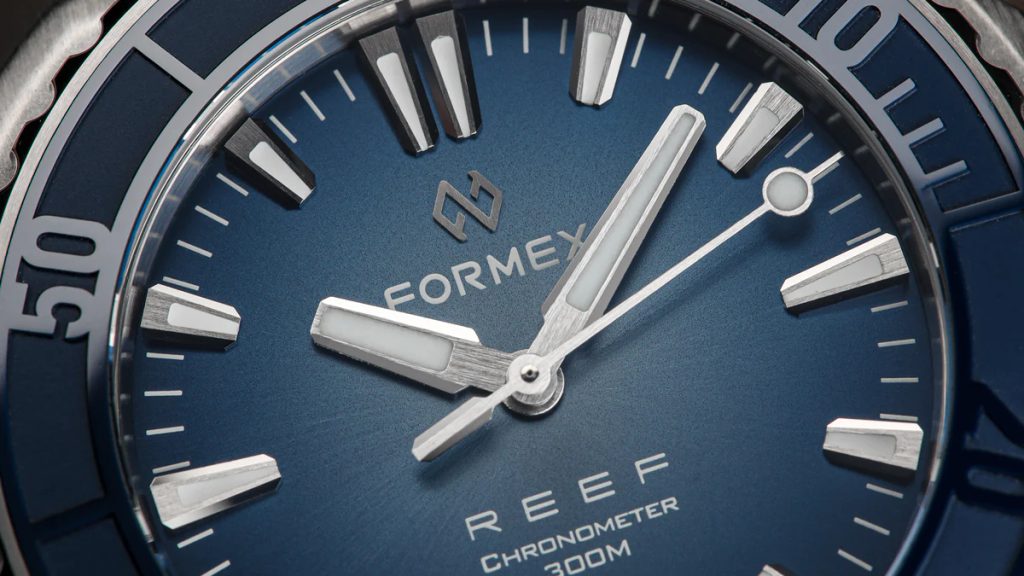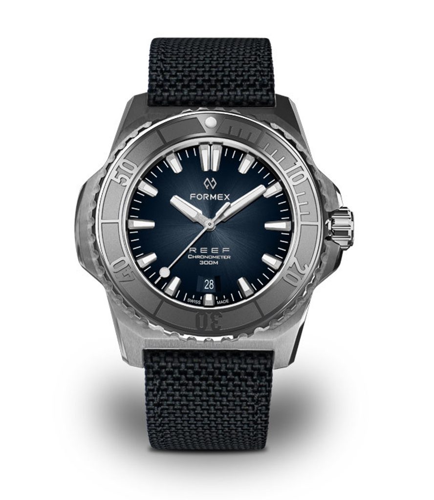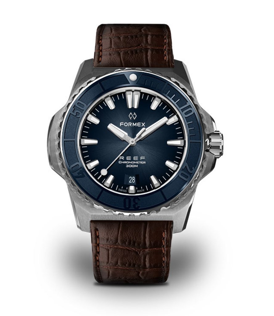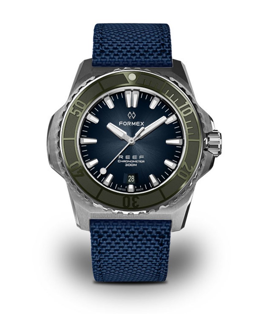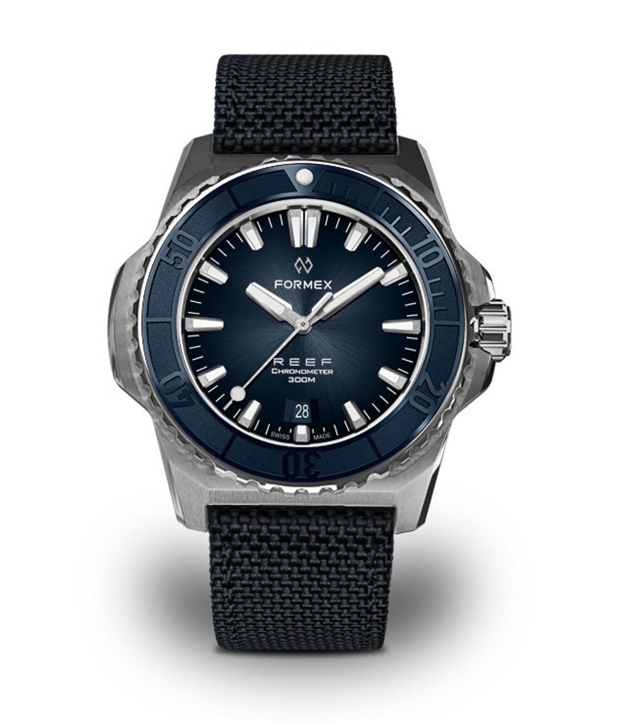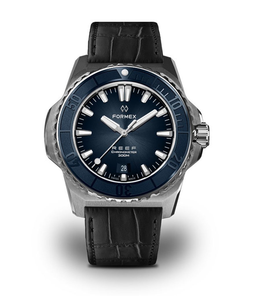 Švajčiarske potápačské hodinky Formex Reef 42 Automatic Chronometer Blue Dial na prvý pohľad zaujmú výrazným, jasne rozpoznateľným puzdrom a dokonale čitateľným ciferníkom. Ide o moderný pohľad na potápačské hodinky vhodné na každú príležitosť, ktoré sa vyznačujú jednoduchými líniami, vysokou odolnosťou a vynikajúcou prehľadnosťou.