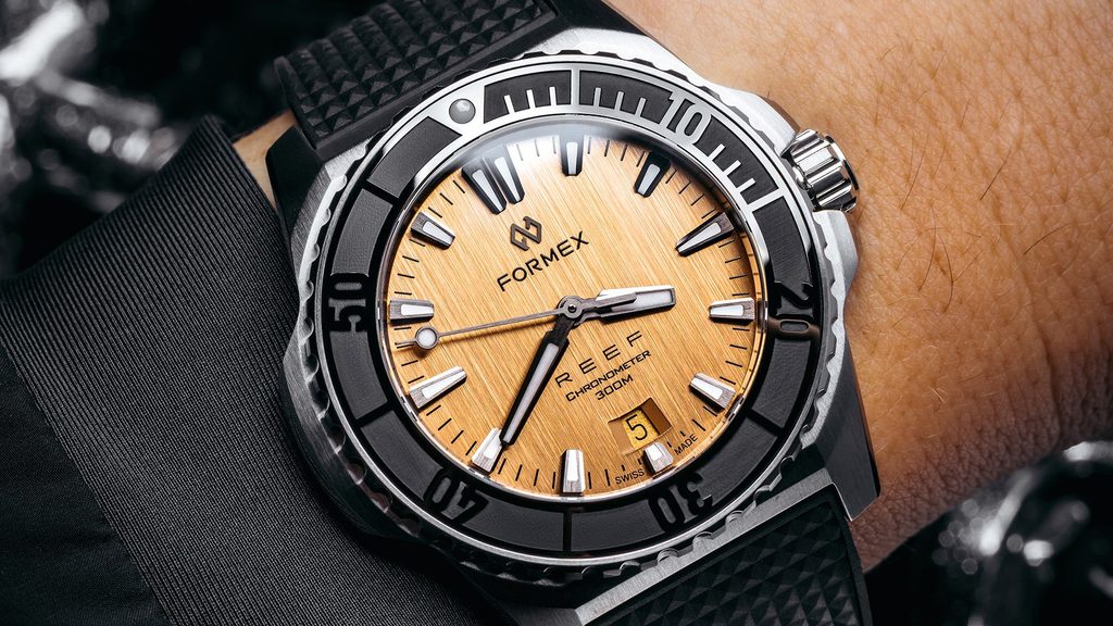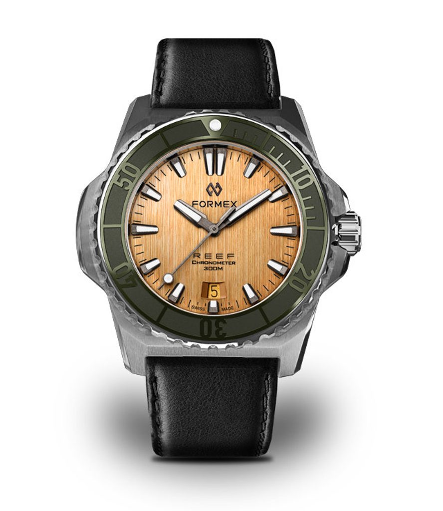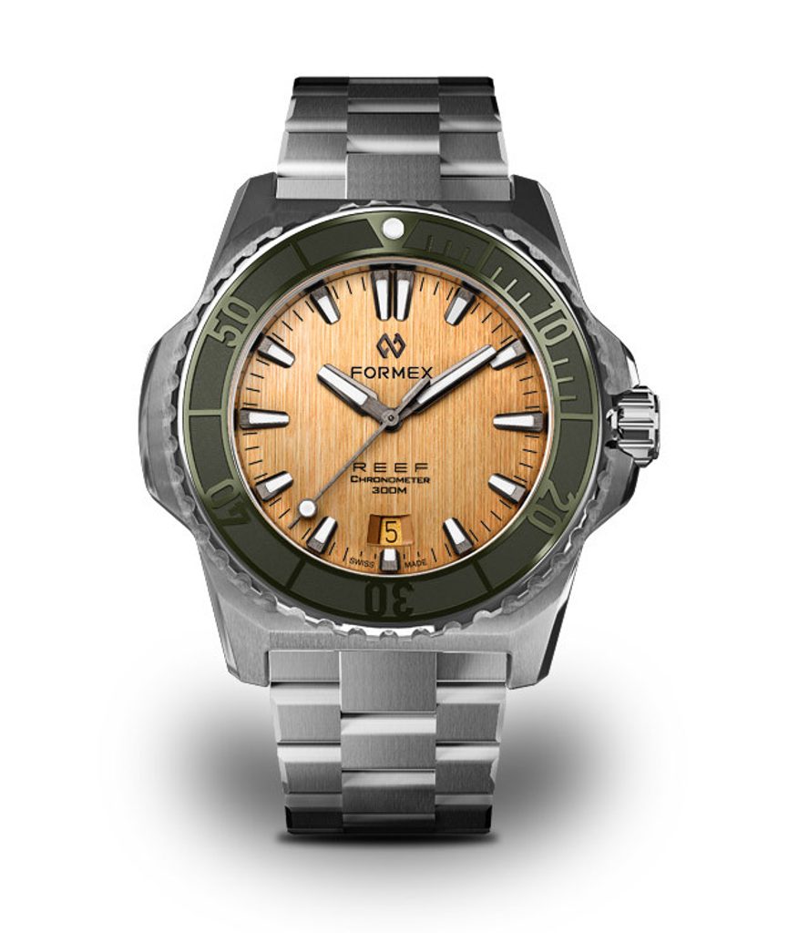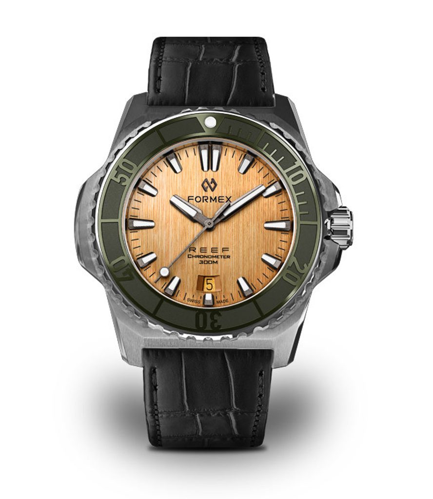 Švajčiarske potápačské hodinky Formex Reef 42 Automatic Chronometer Bronze Dial na prvý pohľad zaujmú výrazným bronzovým ciferníkom a jasne rozpoznateľným puzdrom. Ide o moderné poňatie potápačských hodiniek vhodné na každú príležitosť, ktoré sa vyznačujú jednoduchými líniami, vysokou odolnosťou a vynikajúcou prehľadnosťou.
