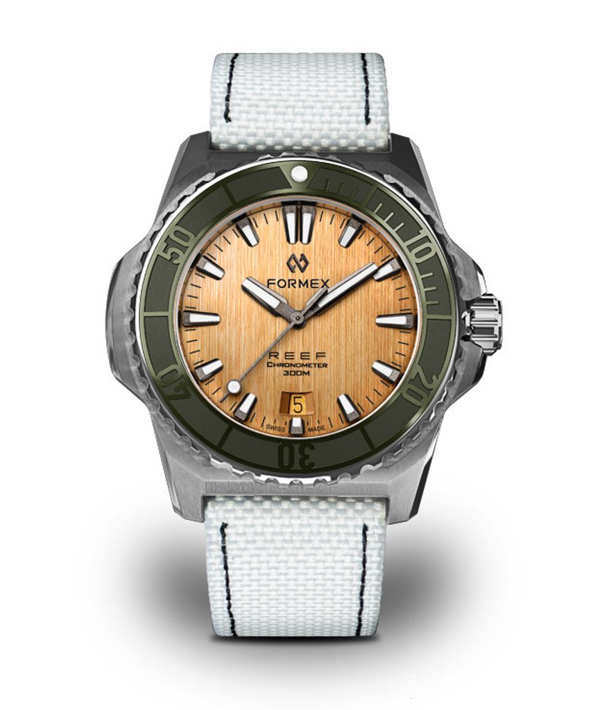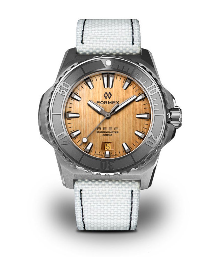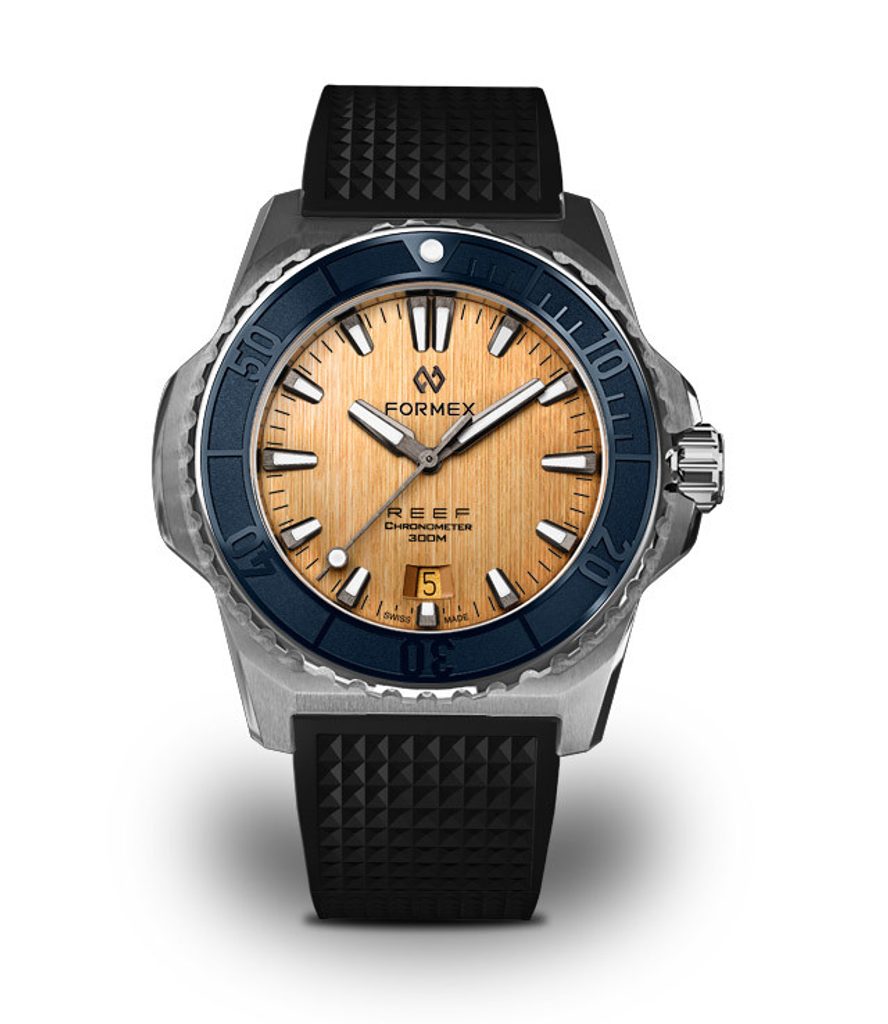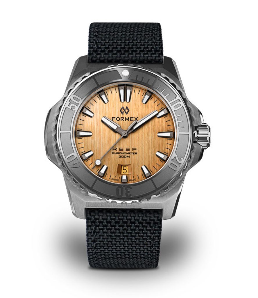 Medzi klasické charakteristické znaky hodiniek Formex Reef 42 Automatic Chronometer patrí výrazný a ľahko čitateľný ciferník, vyššia vodotesnosť a jemná mikroregulovateľná spona. Prehľadný ciferník chráni zafírové sklíčko s vnútornou antireflexnou vrstvou a vysokou odolnosťou proti poškriabaniu. Lepšiu čitateľnosť za zhoršených svetelných podmienok zabezpečuje luminiscencia (BGW9 Super-LumiNova) umiestnená na ručičkách a indexoch. Ciferník z dielne Formex poteší kartáčovaným povrchom a tvarom ručne aplikovaných plastových trojuholníkových indexov, ktoré sa zvažujú od okrajov smerom k stredu ciferníka. Celkový dojem podčiarkuje citlivo navrhnutá dátumovka na 6. hodine. Na hodinkách najviac oceníte ich všestrannosť; vďaka súboru funkcií sú ideálne na použitie pri športe, vo vode, ale aj na každodenné používanie.