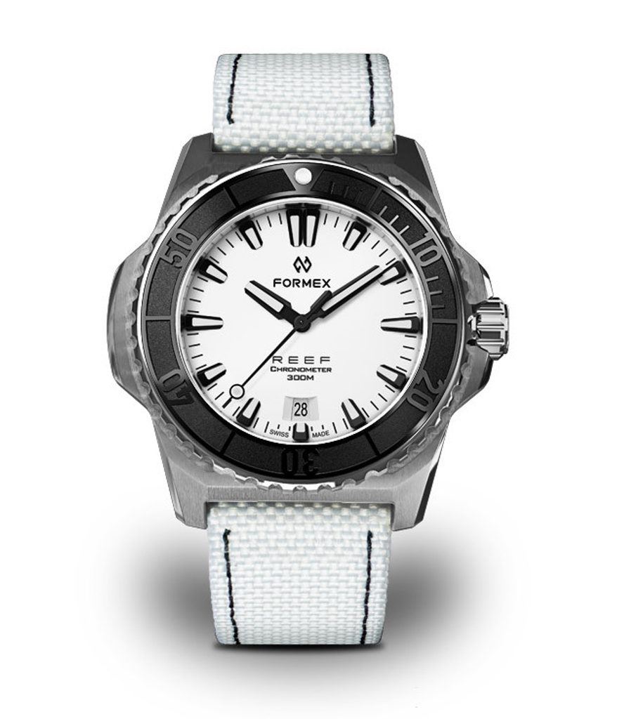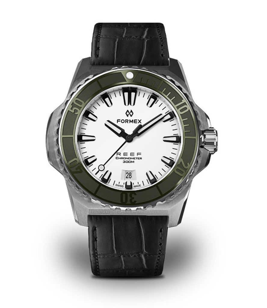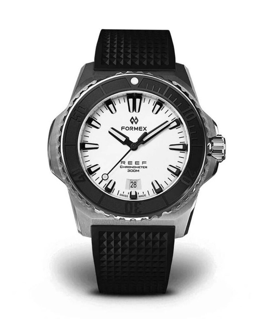 Švajčiarske potápačské hodinky Formex Reef 42 Automatic Chronometer White Dial na prvý pohľad zaujmú výrazným, jasne rozpoznateľným puzdrom a dokonale čitateľným ciferníkom. Ide o moderný pohľad na potápačské hodinky vhodné na každú príležitosť, ktoré sa vyznačujú jednoduchými líniami, vysokou odolnosťou a vynikajúcou prehľadnosťou.