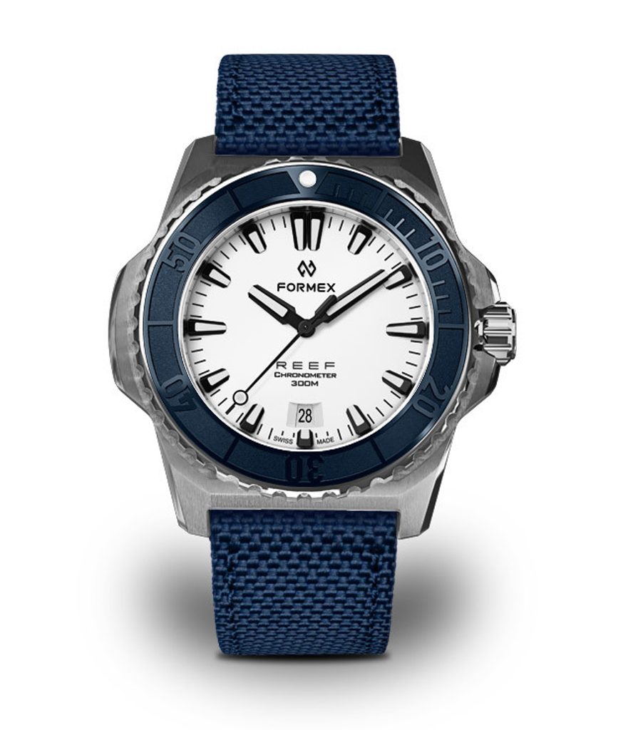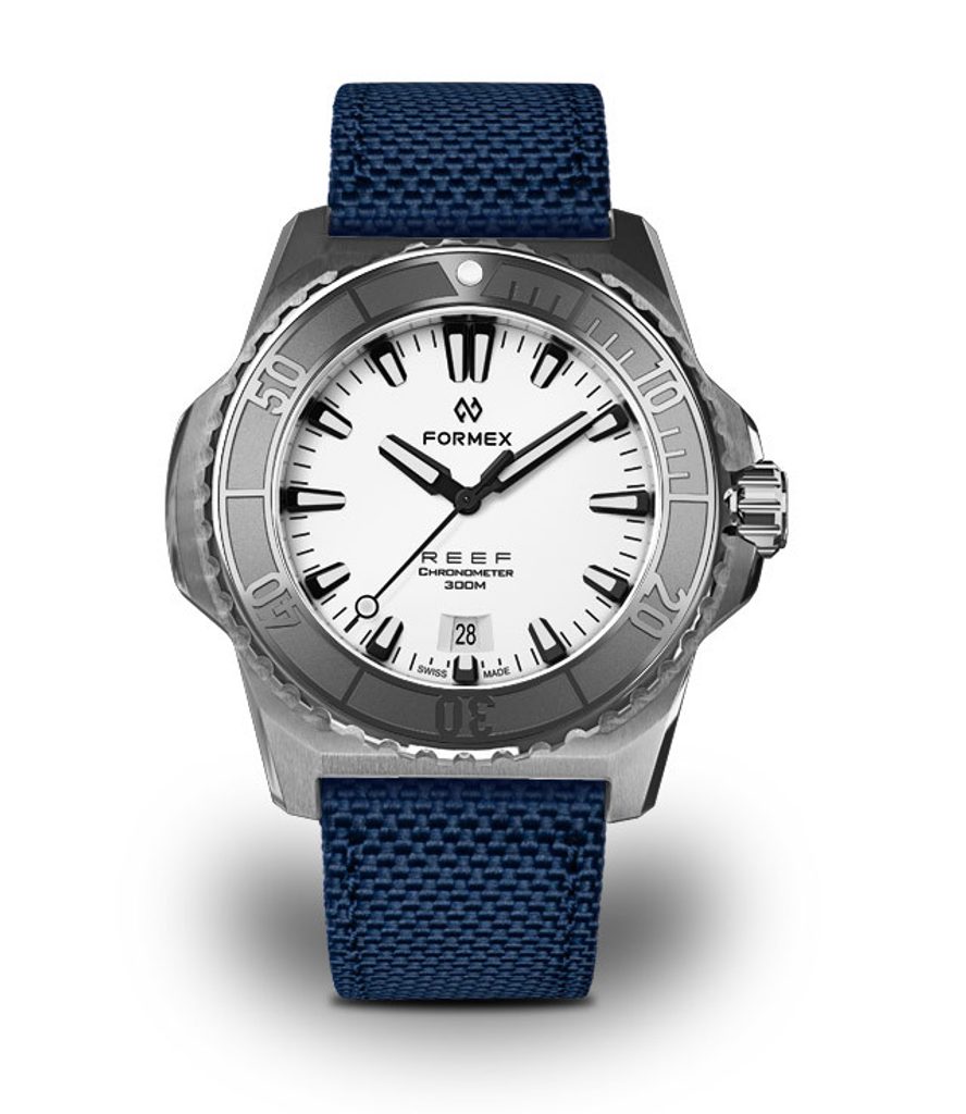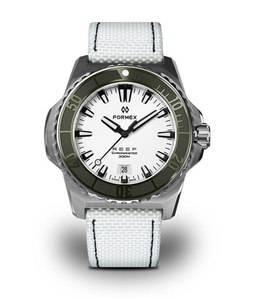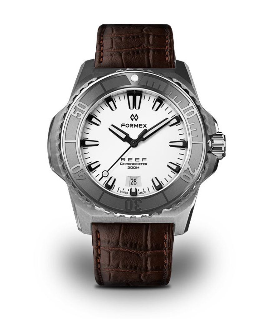 Švajčiarske potápačské hodinky Formex Reef 42 Automatic Chronometer White Dial na prvý pohľad zaujmú výrazným, jasne rozpoznateľným puzdrom a dokonale čitateľným ciferníkom. Ide o moderný pohľad na potápačské hodinky vhodné na každú príležitosť, ktoré sa vyznačujú jednoduchými líniami, vysokou odolnosťou a vynikajúcou prehľadnosťou.