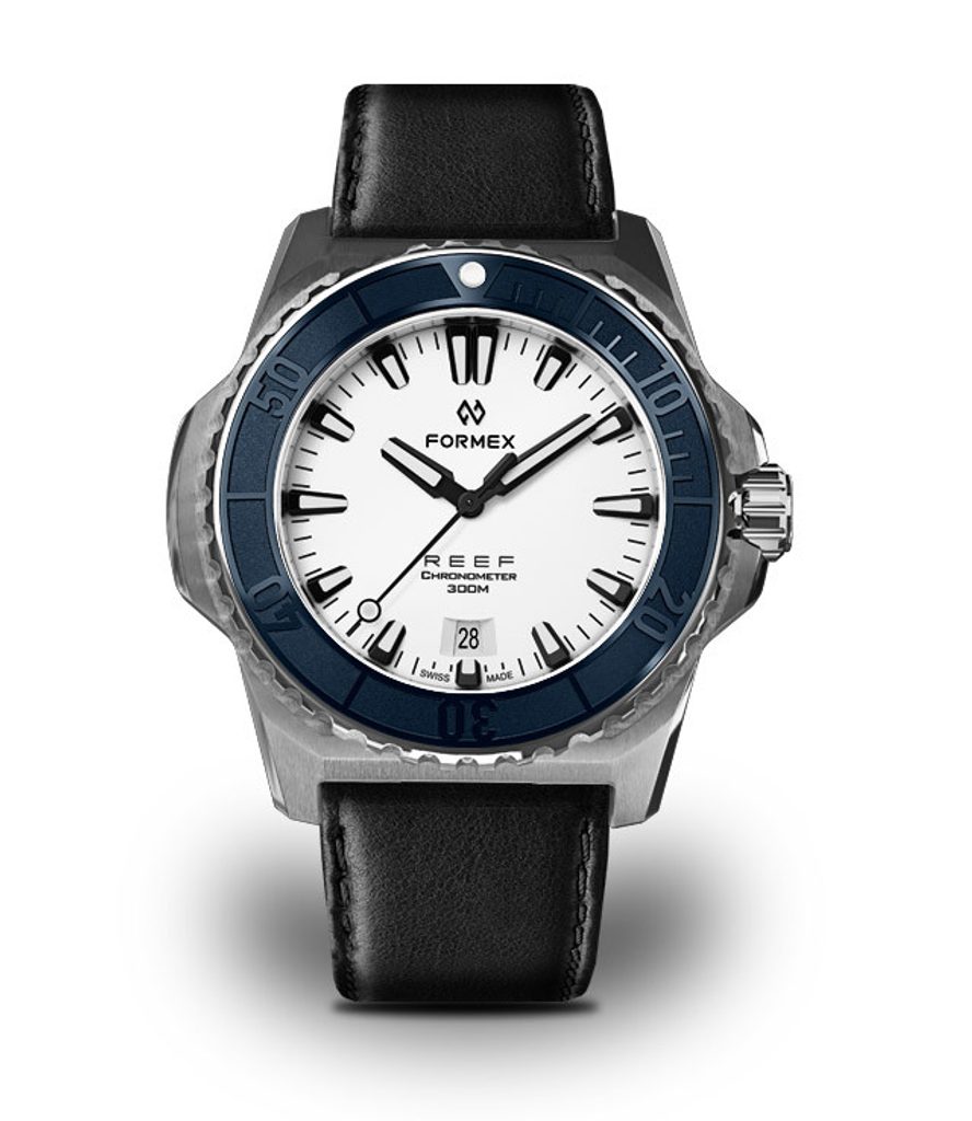 Medzi klasické charakteristické znaky hodiniek Formex Reef 42 Automatic Chronometer patrí výrazný a ľahko čitateľný ciferník, vyššia vodotesnosť a jemná mikroregulovateľná spona. Prehľadný ciferník chráni zafírové sklíčko s vnútornou antireflexnou vrstvou a vysokou odolnosťou proti poškriabaniu. Lepšiu čitateľnosť za zhoršených svetelných podmienok zabezpečuje luminiscencia (BGW9 Super-LumiNova) umiestnená na ručičkách a indexoch. Ciferník od spoločnosti Formex poteší ručne aplikovanými reliéfnymi trojuholníkovými indexmi, ktoré sa zvažujú od okrajov smerom k stredu ciferníka. Celkový dojem umocňuje citlivo navrhnutý ukazovateľ dátumu na pozícii 6 hodín. Na hodinkách najviac oceníte ich všestrannosť; vďaka súboru funkcií sú ideálne na použitie pri športe, vo vode, ale aj na každodenné používanie.