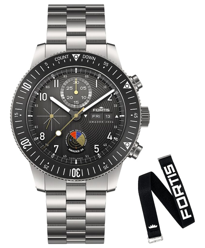 Hodinky Fortis Novonaut N-42 Amadee-24 Limited Edition F2040016 majú puzdro vyrobené z titánu a sú doplnené napínacím strojčekom z rovnakého materiálu. Jemné nastavenie dĺžky náramku bez použitia nástrojov umožňuje posuvný mechanizmus na zapínaní. Súčasťou balenia je aj špeciálny čierny elastický nylonový remienok. V puzdre spoľahlivo pracuje manufaktúrny švajčiarsky mechanický strojček Fortis WERK 17 (vyrobený pre Fortis v spolupráci s manufaktúrou La Joux-Perret) s automatickým naťahovaním. Pracuje s frekvenciou 28 800 polfrekvencií za hodinu, má 26 drahokamov a predĺženú rezervu chodu na 60 hodín. Funkcia stopiek sa dá využiť s počítadlom minút na 12. hodine a počítadlom hodín na 6. hodine. Strojček má aj funkciu "hacking" (zastavenie sekundovej ručičky na príkaz) a možnosť ručného naťahovania korunkou. Na pozícii 3 hodín nájdeme praktický ukazovateľ dátumu a dňa v týždni. Na meranie časových úsekov slúži obojsmerne rotujúca keramická luneta, ktorá je prispôsobená na meranie času. Ďalším zaujímavým prvkom je systém MCB™ (Mission Control Bezel) - dve ďalšie luminiscenčné ručičky na lunete, ktoré sú od seba vzdialené 10 minút. Časové oneskorenie v komunikácii medzi Marsom a Zemou je totiž len 10 minút, takže astronauti môžu jednoduchým otočením lunety sledovať, ako dlho bude trvať ďalšia komunikácia z pozemnej kontroly.