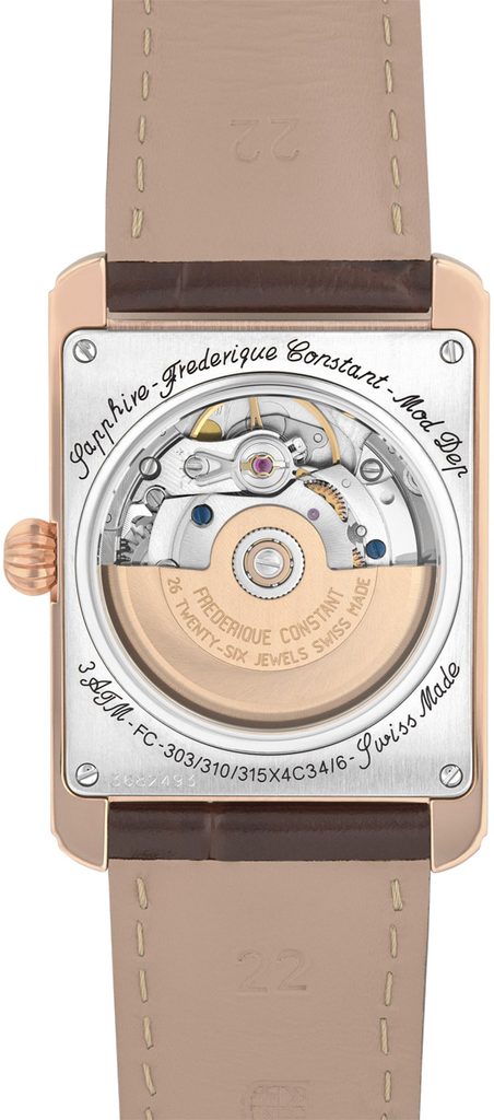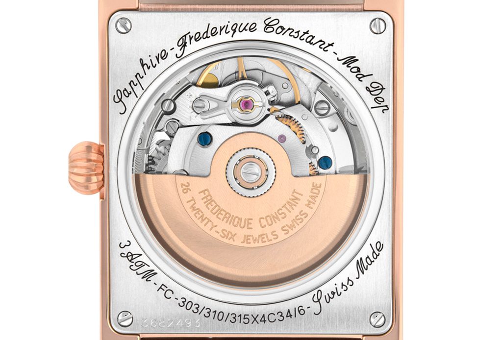 Puzdro hodiniek Frederique Constant FC-303V4C24 je vyrobené z ušľachtilej ocele s povrchovou úpravou ružovým zlatom PVD a je doplnené koženým remienkom. Vo vnútri puzdra spoľahlivo pracuje švajčiarsky mechanický strojček FC-303 (vychádzajúci z modelu Sellita SW200) s automatickým naťahovaním. Pracuje s frekvenciou 28 800 polfrekvencií za hodinu a má 26 drahokamov. Činnosť strojčeka možno pozorovať cez priehľadnú matricu. Na pozícii šiestich hodín nájdeme praktický ukazovateľ dátumu.