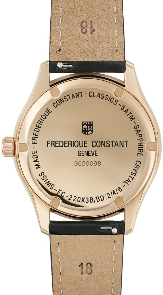 Puzdro hodiniek Frederique Constant FC-220MB3B4 je vyrobené z ušľachtilej ocele s povrchovou úpravou PVD z ružového zlata a je doplnené koženým remienkom. Vo vnútri puzdra spoľahlivo pracuje švajčiarsky batériový strojček FC-220 (na báze Ronda 785). Na pozícii šiestich hodín nájdeme praktický ukazovateľ dátumu.