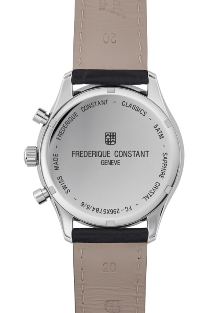 Puzdro hodiniek Frederique Constant FC-296SW5B6 je vyrobené z ušľachtilej ocele a je doplnené koženým remienkom. Vo vnútri puzdra spoľahlivo pracuje švajčiarsky batériový strojček FC-296 (na báze Ronda 5040.F) s trinástimi drahokamami. Disponuje funkciou stopiek a praktickým ukazovateľom dátumu v podobe ručičky, ktorá zobrazuje dátum po obvode ciferníka. Na pozícii dvanástich hodín sa nachádza aj ukazovateľ dňa v týždni a mesiaca.