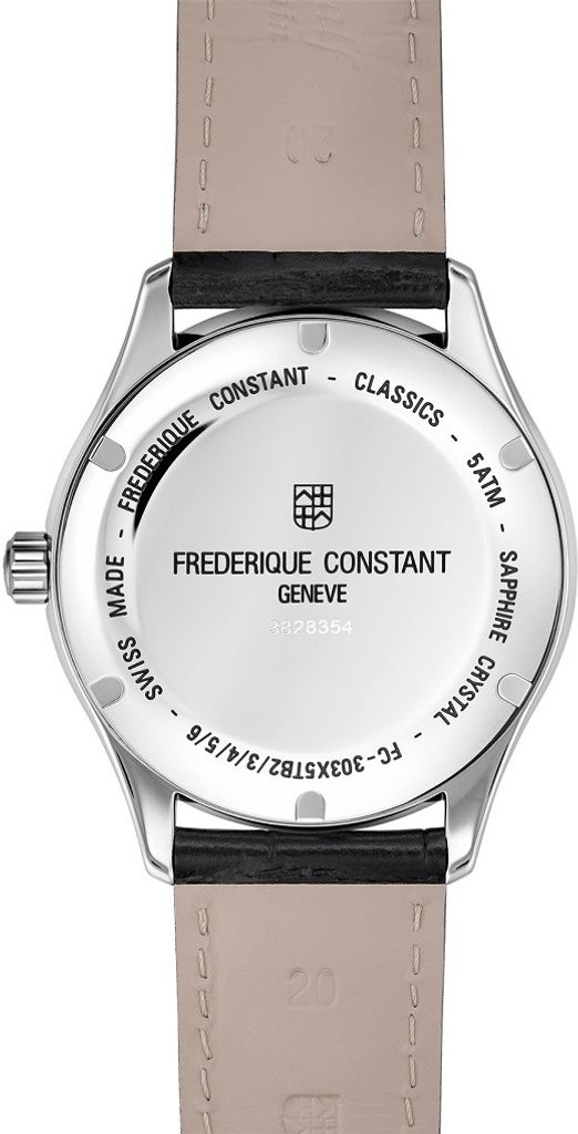 Puzdro hodiniek Frederique Constant FC-303MC5B6 je vyrobené z ušľachtilej ocele a je doplnené koženým remienkom. Vo vnútri puzdra spoľahlivo pracuje švajčiarsky mechanický strojček FC-303 (vychádzajúci z modelu Sellita SW200) s automatickým naťahovaním. Pracuje s frekvenciou 28 800 polfrekvencií za hodinu a má 26 drahokamov. Na tradičnej pozícii tretej hodiny nájdeme praktický ukazovateľ dátumu.