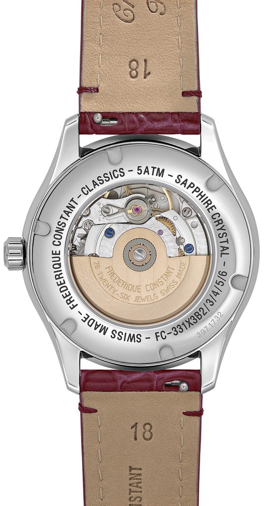 Puzdro hodiniek Frederique Constant FC-331MPWRD3B6 je vyrobené z ušľachtilej ocele a je doplnené koženým remienkom. Vo vnútri puzdra spoľahlivo tiká švajčiarsky mechanický strojček FC-331 (na báze Sellita SW280) s automatickým naťahovaním. Pracuje s frekvenciou 28 800 polfrekvencií za hodinu, má 26 drahokamov a ukazovateľ fázy mesiaca na pozícii šiestich hodín. Činnosť strojčeka možno pozorovať vďaka priehľadnému ciferníku.