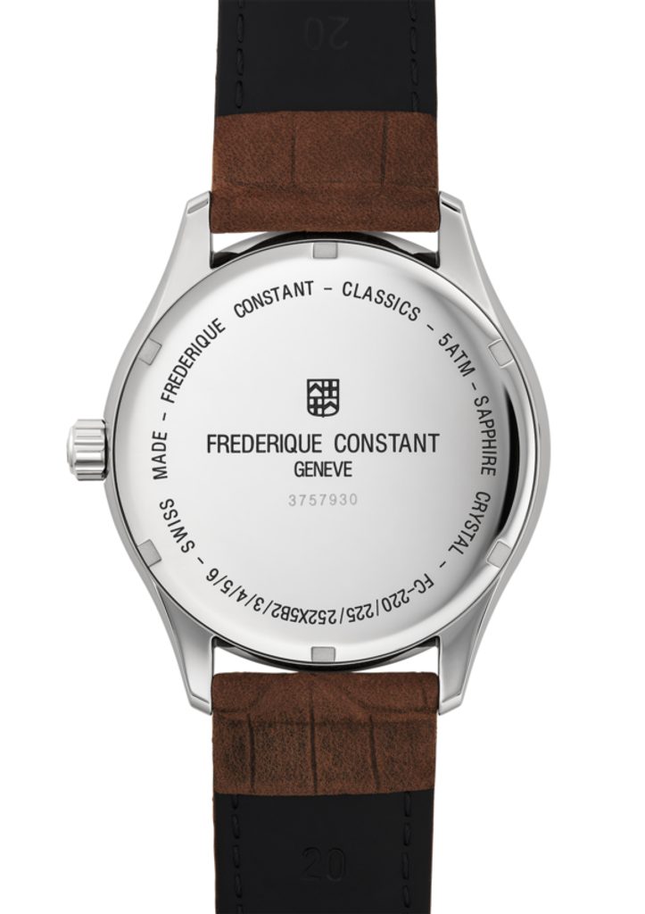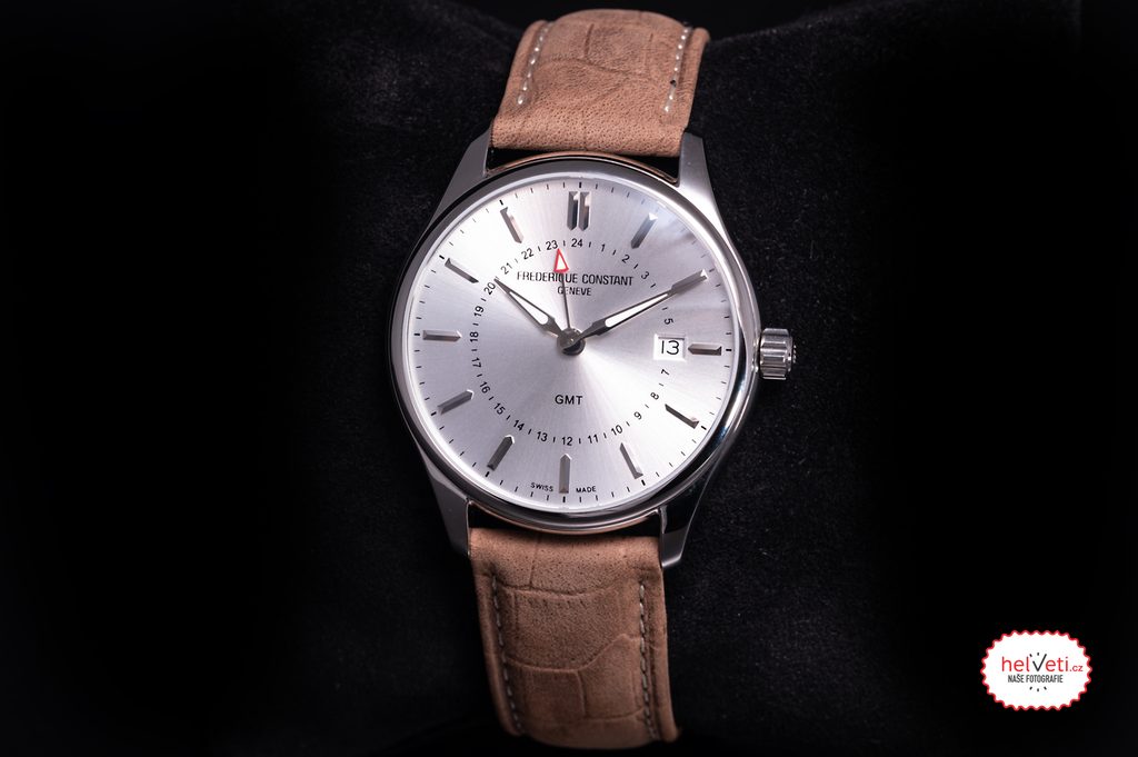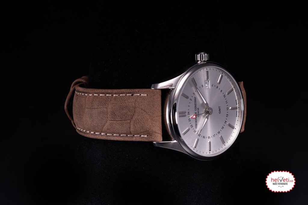 Puzdro hodiniek Frederique Constant FC-252SS5B6 je vyrobené z ušľachtilej ocele a je doplnené koženým remienkom. Vo vnútri puzdra spoľahlivo pracuje švajčiarsky batériový strojček FC-252 (na báze Ronda 515.24H) s jedným drahokamom. Ten má funkciu GMT, t. j. indikáciu druhého časového pásma pomocou štvrtej ručičky v 24-hodinovom formáte. Na tradičnej pozícii tretej hodiny nájdeme praktický ukazovateľ dátumu.