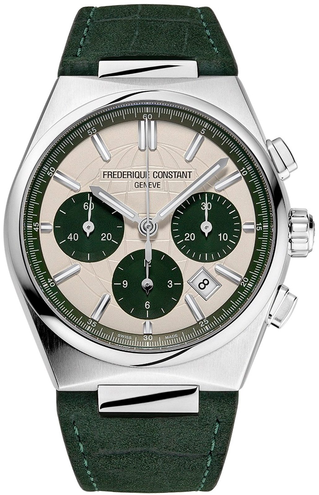 Puzdro hodiniek Frederique Constant FC-391SGR4NH6 je vyrobené z ušľachtilej ocele a je doplnené koženým remienkom. Súčasťou balenia je aj prídavné oceľové ťahadlo. Strojček aj remienok majú rýchloupínacie spony, a preto sa dajú rýchlo a jednoducho vymeniť bez použitia náradia. Vo vnútri puzdra spoľahlivo pracuje švajčiarsky mechanický strojček FC-391 (vychádza z modelu La Joux-Perret Chronographe Manufacture L100) s automatickým naťahovaním. Pracuje s frekvenciou 28 800 polfrekvencií za hodinu a má 26 drahokamov. Tento strojček má funkciu chronografu, t. j. stopiek. Veľká centrálna sekundová ručička slúži ako stopky, na subciferníku na pozícii 9 hodín sa nachádza počítadlo minút, zatiaľ čo subciferník na pozícii 6 hodín slúži ako počítadlo hodín. Za zmienku stojí aj predĺžená rezerva energie 60 hodín. Činnosť strojčeka je možné pozorovať cez priehľadný spúšťací mechanizmus. Na pozícii 4-5 nájdeme praktický ukazovateľ dátumu.