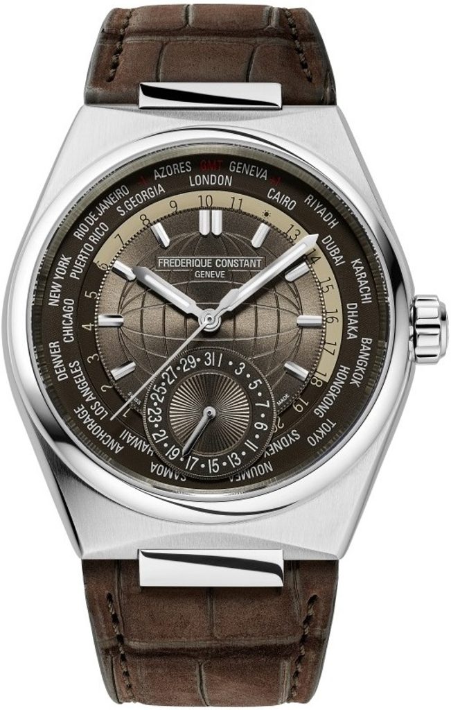 Puzdro hodiniek Frederique Constant FC-718C4NH6 je vyrobené z nehrdzavejúcej ocele a je doplnené remienkom z kože aligátora. Súčasťou balenia je aj prídavný oceľový náramok. Strojček aj remienok majú rýchloupínacie spony, a preto sa dajú rýchlo a jednoducho vymeniť bez použitia náradia. Vo vnútri puzdra spoľahlivo pracuje švajčiarsky mechanický strojček FC-718 s automatickým naťahovaním. Pracuje s frekvenciou 28 800 polfrekvencií za hodinu a má 26 drahokamov. Strojček má funkciu Worldtimer, ktorú ocenia najmä cestovatelia. Vďaka nej možno pomocou rotujúceho kotúča odčítať čas v rôznych časových pásmach v 24-hodinovom formáte. K dispozícii je aj indikácia dňa a noci. Tento krásne zdobený strojček možno pozorovať vďaka priehľadnému ciferníku. Na pozícii šiestich hodín nájdeme netradične riešený ukazovateľ dátumu v podobe subciferníka s ručičkou.