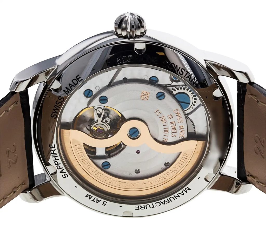 Puzdro hodiniek Frederique Constant FC-710MC4H6 je vyrobené z ušľachtilej ocele a je doplnené koženým remienkom. Vo vnútri puzdra spoľahlivo pracuje švajčiarsky mechanický strojček FC-710 s automatickým naťahovaním. Pracuje s frekvenciou 28 800 polfrekvencií za hodinu a má 26 drahokamov. Tento nádherne zdobený strojček možno pozorovať vďaka priehľadnému ciferníku. Na pozícii šiestich hodín nájdeme netradične riešený ukazovateľ dátumu v podobe subciferníka s ručičkou.