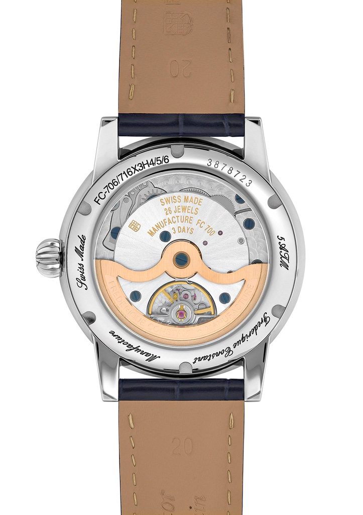 Puzdro hodiniek Frederique Constant FC-706S3H6 je vyrobené z ušľachtilej ocele a je doplnené remienkom z aligátorovej kože. Vo vnútri puzdra spoľahlivo pracuje švajčiarsky mechanický strojček FC-706 s automatickým naťahovaním. Pracuje s frekvenciou 28 800 polfrekvencií za hodinu a má 26 drahokamov. Tento nádherne zdobený strojček možno pozorovať vďaka priehľadnému ciferníku. Na pozícii šiestich hodín nájdeme netradične riešený ukazovateľ dátumu v podobe subciferníka s ručičkou. Oproti svojmu predchodcovi (FC-710) prináša tento strojček predĺženú rezervu chodu na 72 hodín - teda tri dni.