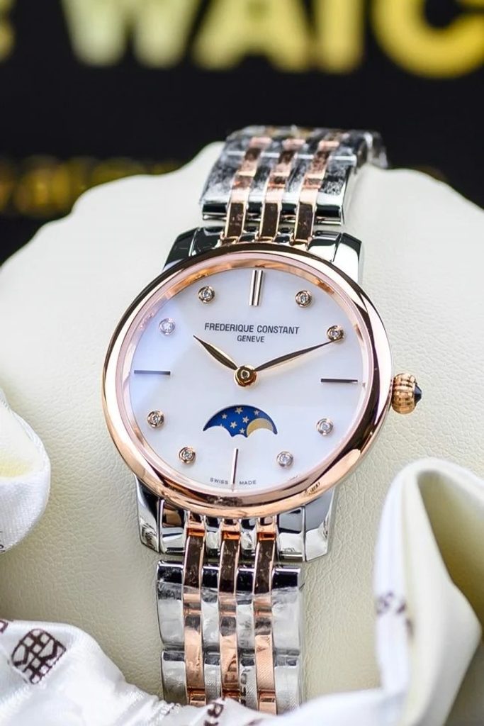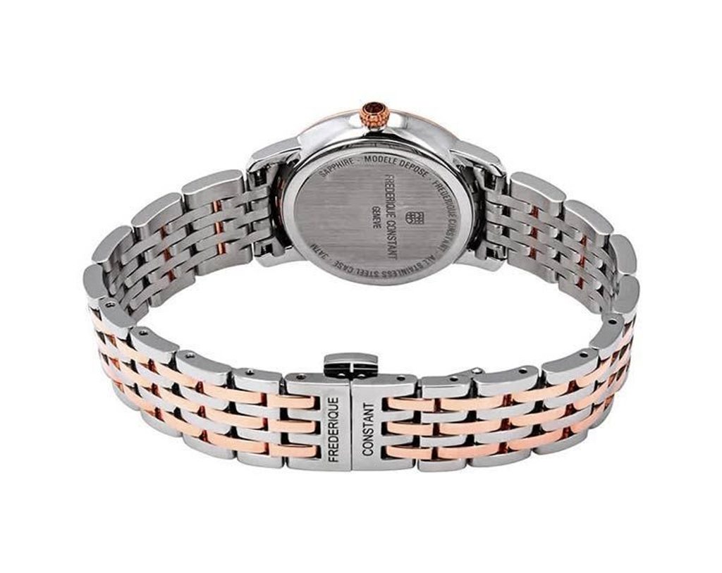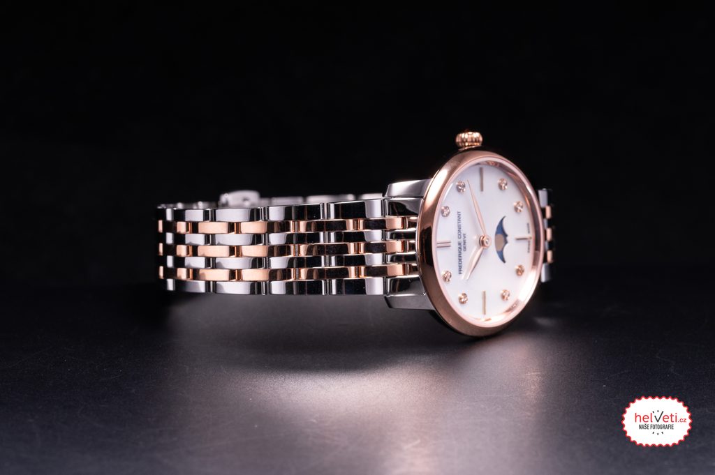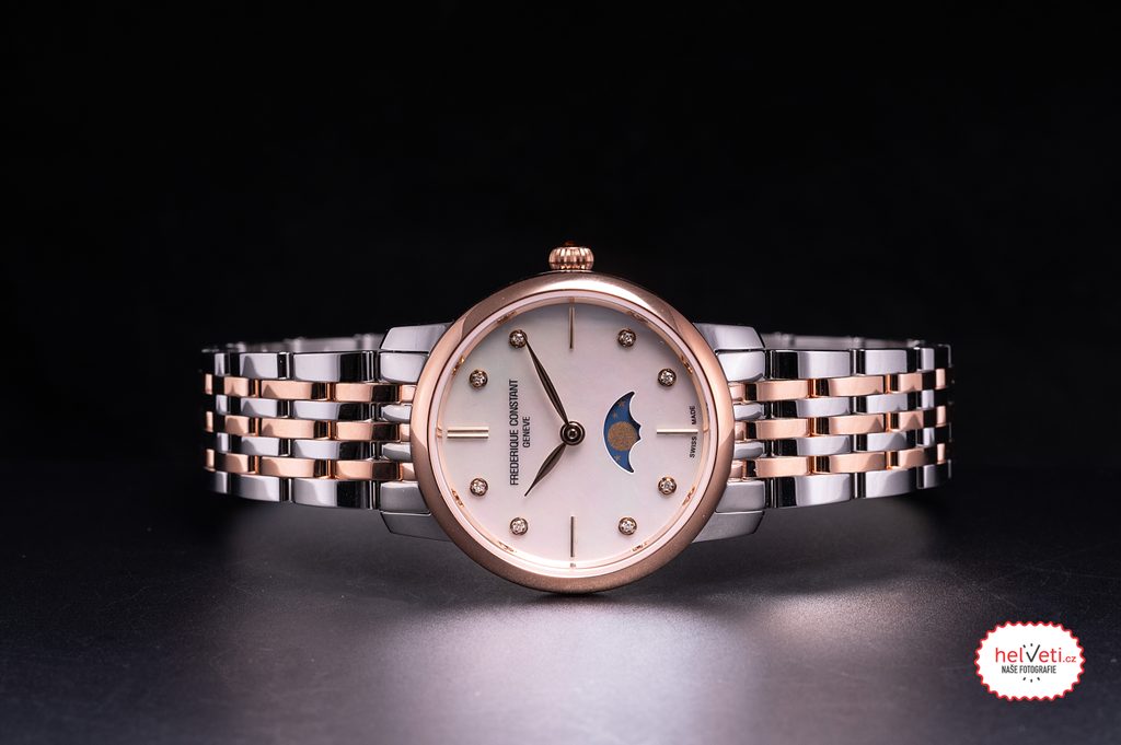 Puzdro týchto hodiniek je vyrobené z ušľachtilej ocele s čiastočnou PVD úpravou v ružovom zlate, rovnako ako náramok. Vo vnútri puzdra spoľahlivo pracuje švajčiarsky batériový strojček FC-206 (základ modelu Ronda 706) s piatimi drahokamami. Ten má na pozícii šiestich hodín funkciu ukazovateľa fázy mesiaca. Ciferník zdobí osem diamantov (0,04 ct). Korunka týchto hodiniek je zdobená kabošonovým kameňom.