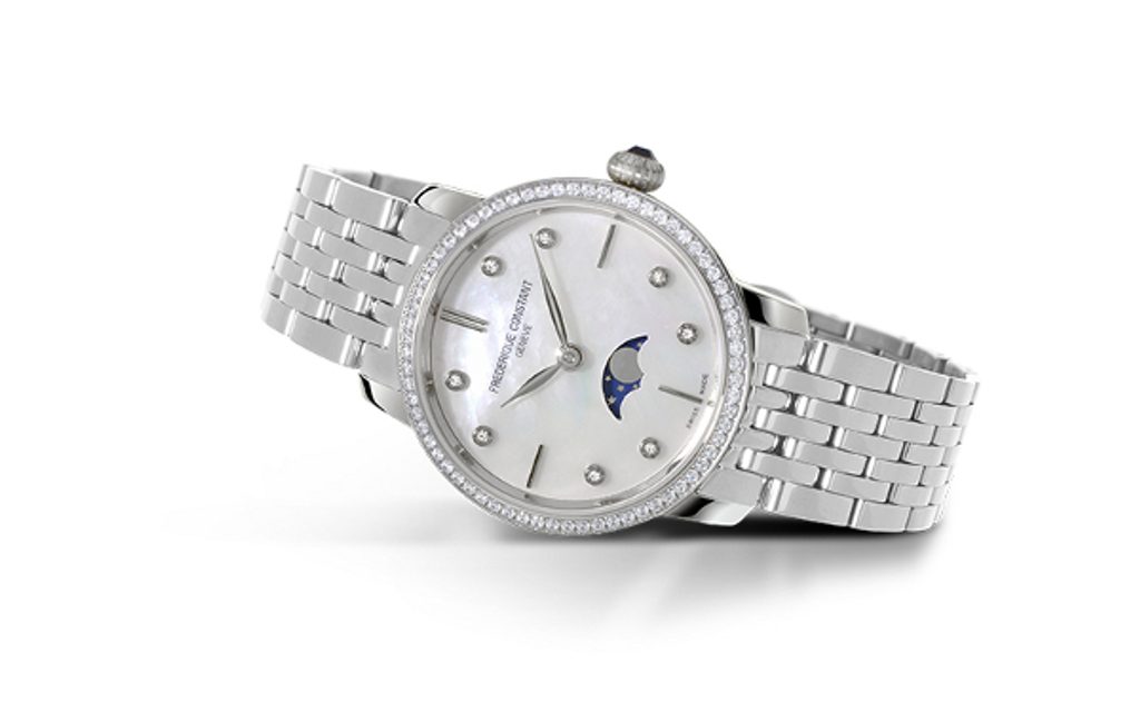 Hodinky Frederique Constant Slimline Ladies Moonphase Quartz FC-206MPWD1SD6B patria do série Slimline a vďaka svojmu elegantnému vzhľadu sú vhodné ako doplnok do spoločnosti. Dobre však poslúžia aj na každodenné nosenie. Hodinky radu Slimline sú mimoriadne pohodlné vďaka veľmi nízkej výške puzdier.